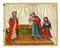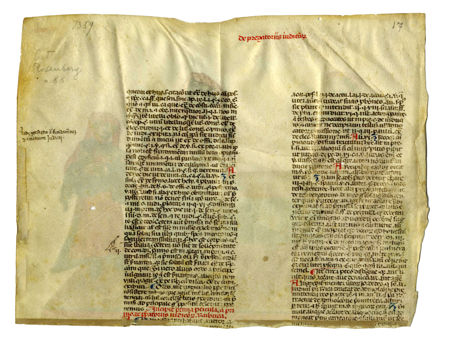 De prefatoriis iudicorum. XIV secolo ca. Tempera a colori su pergamena. mm 197x257. Al margine superiore destro del recto è indicato a inchiostro rosso il numero romano "CXXIII". Verso: Al margine superiore il titolo a inchiostro rosso "De prefatoriis iudicorum". Manoscritto pergamenaceo con testo in latino a inchiostro bruno in scrittura gotica rotonda con manicula e marginalia "[...] contestatio et fundamentum ad initium Judicij".Iniziali calligrafiche in inchiostro rosso e blu. Titolo della rubrica a inchiostro rosso: "Incipit prima particula ad primo de prefatorius iudicorum. Rubrica". Specchio di scrittura: mm 150x200 ca. L'episodio sembra raffigurare la presentazione di una causa a un dottore anziano, a sinistra con toga rossa ornata di pelliccia, da parte di un giovane intento ad argomentare alla presenza di un assistente che tiene tra le braccia tre volumi. Al verso nota a matita di grafite "7359 / Cat Rosenberg n. 88". (1)