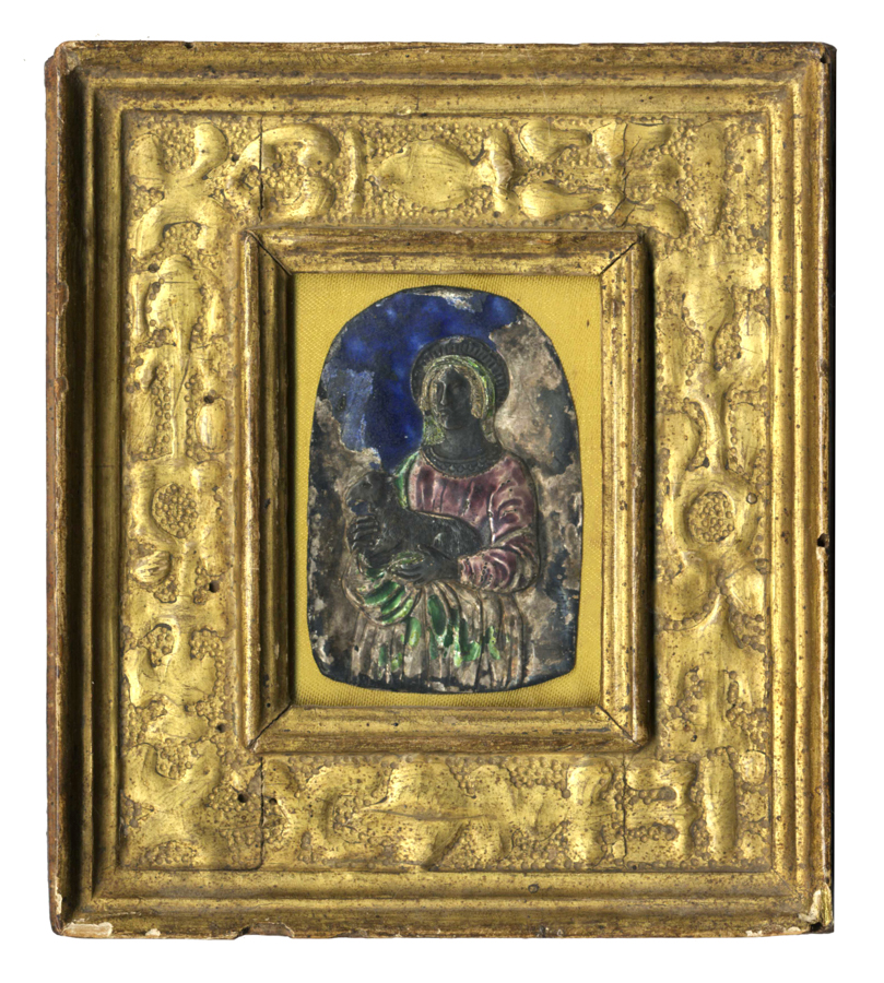 Anonimo del XV secolo, Sant'Agnese. Fine XV secolo. Placchetta centinata a sbalzo in argento e smalto a colori, azzurro, verde vivo, rosa violaceo. cm 7,5x5. (1)