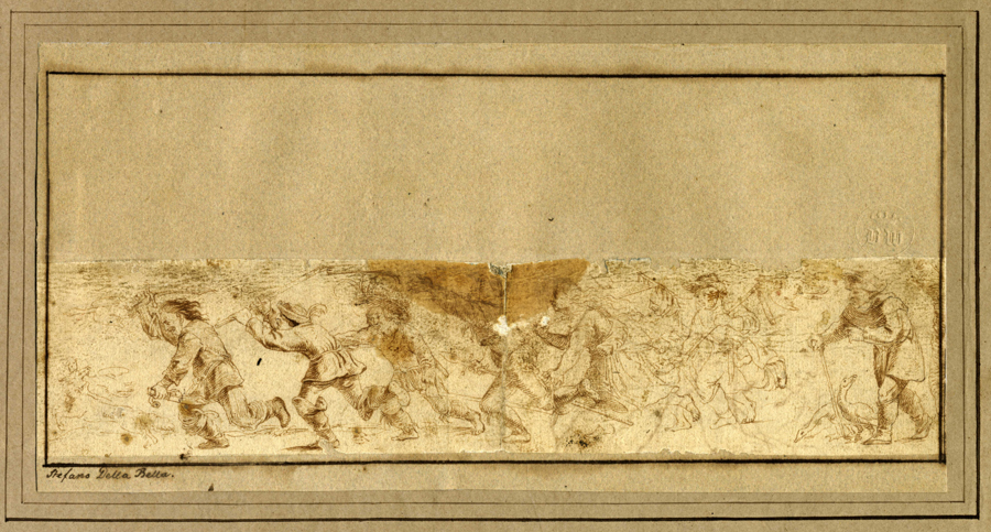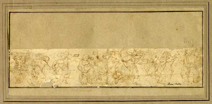 Johann Theodor De Bry [alla maniera di], Fregio con danza paesana e altro con scena di caccia alle oche. 1600 ca. Penna e inchiostro bruno su carta vergellata sottile color sabbia. Riquadro a penna e inchiostro bruno. mm 55/56x258/283. Entrambi i fogli applicati a pieno su vecchio supporto in cartoncino leggero color grigio-verde. Sul montaggio dell'uno a penna e inchiostro bruno "Stefano Della Bella", in basso nella composizione dell'altro "Della Bella". Su entrambi marchio a secco del collezionista danese Benjamin Wolff (Engelholm, Naestvad, 1790–1866) (Lugt, 420). Con il supporto mm 127/128x258/283. Il fregio con contadini che danzano sembra confrontabile con un bulino di Johann Theodor de Bry di soggetto simile da una serie in cinque tavole (Hollstein, 17-21). (2)