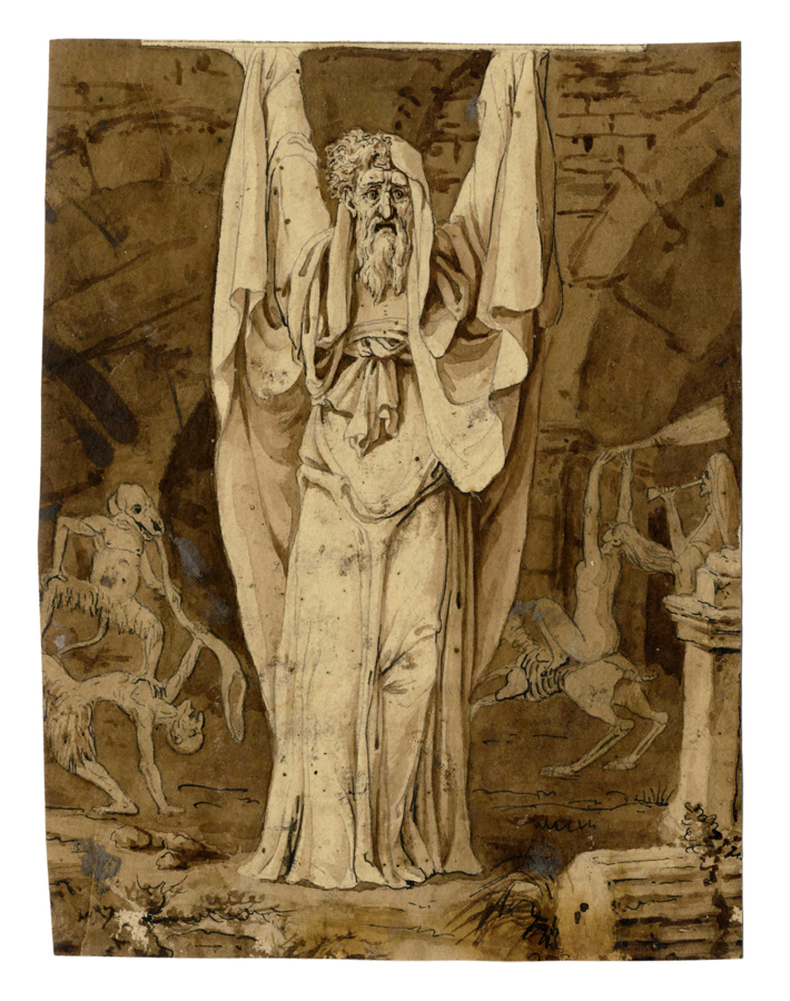 Johann Heinrich Füssli [alla maniera di], Stregone e scena di sabba. 1804-1810 ca. Penna e inchiostro bruno, pennello e acquerello marrone e seppia su tracce di matita di grafite. Carta avorio riportata su tela a trama fine. mm 217x165. Scena di stregoneria con al centro una figura con occhi esorbitanti nell'atto di invocare il diavolo con gesto enfatico, e sul fondo demoni e una strega che cavalca lo scheletro di un animale. L'ambito di esecuzione sembra quello della cerchia di Füssli e del suo universo sovrannaturale popolato da figure mostruose e demoniache. (1)