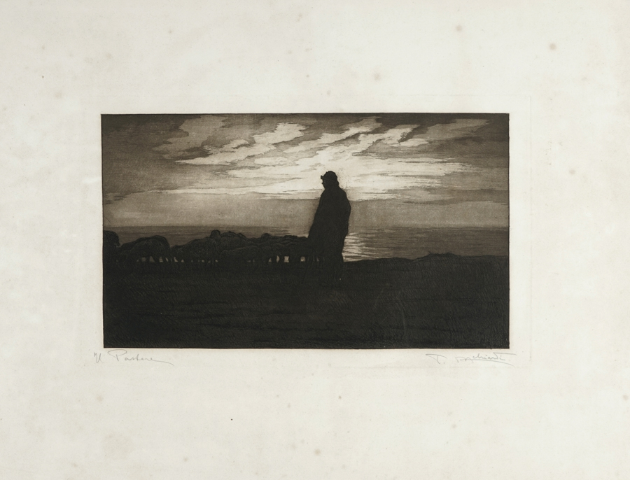 Pietro D'Achiardi, Il pastore. 1920 ca. Acquatinta. mm 250x400. Foglio: mm 470x610. Titolata e firmata a matita in basso ai lati. (1)