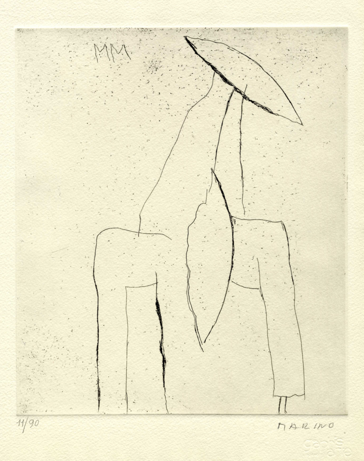 Marino Marini, Senza titolo. Acquaforte. mm 245x210. Foglio: mm 300x240. Siglato in lastra in alto a sinistra, firmato a matita in basso a destra. Numero di tiratura a matita in basso a sinistra. Edizione Graphis Arte di Livorno della quale compare il timbro a secco all'angolo inferiore destro. Es. 11/90. (1)