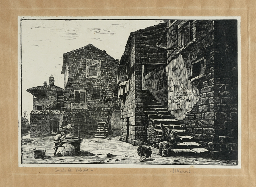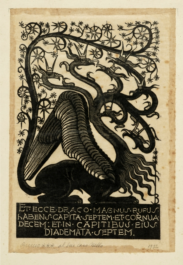 Bruno Marsili (detto Bruno Da Osimo), Et ecce draco magnus rufus habens capita septem, et cornua decem: et in capitibus ejus diademata septem. 1932. Xioografia su velina applicata su cartoncino. mm 195x135. Foglio: mm 220x150. Iscrizione incisa in basso al centro tratta dall'Apocalisse. Firmata "Bruno", dedicata e datata a matita sotto. SI AGGIUNGE: Lidia Pillepich, Cortile di Viterbo. 1932. Xilografia su carta fine applicata su carta pesante. mm 270x415. Foglio: mm 495x615. Firmata e datata nella matrice a destra verso il centro. Titolata e firmata a matita sotto ai lati. (2)
