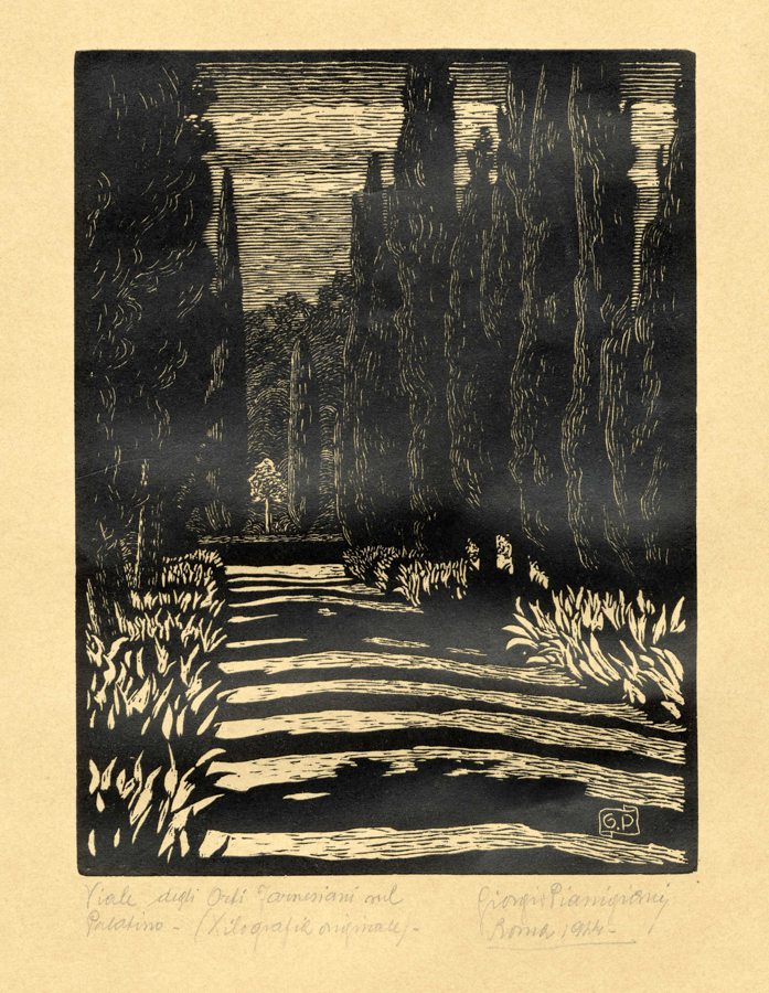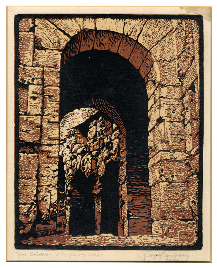Giorgio Pianigiani, Lotto composto di due xilografie. 1924-25. 1) Colosseo. 1925. Xilografia a tre legni. mm 240x193. Foglio: mm 300x240. Monogrammata nella matrice in basso a destra. Numerata "15/100", titolata e firmata a matita sotto.Tiratura dell'artista di un soggetto comparso anche nella rivista "Xilografia" di Francesco Nonni, fascicolo n. 16, aprile 1925. 2) Viale degli Orti Farnesiani sul Palatino. 1924. Xilografia. mm 250x190. Foglio: mm 430x330. Monogrammata nella matrice in basso a destra. Titolata, firmata e datata a matita sotto. (2)