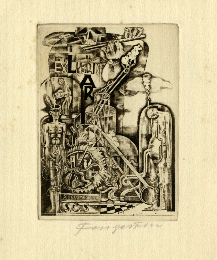 Michel Fingesten, Lotto composto di 5 ex libris. 1937. 1) Ex libris Peter Fingesten. 1937. Puntasecca. mm 147x90. Foglio: mm 197x140. NECHWATAL, P. 60. Firmato a matita al margine inferiore. 2) Ex libris A. P. S.O.S. Macchina che crea bambini. 1937. Fotoriproduzione. mm 130x90. Foglio: mm 177x150. MIRABELLA, BARDAZZI, BALLERINI, N. 278. Firmato a matita al margine inferiore. 3) G. M. Acquaforte su carta vergellata. mm 152x65. MIRABELLA, BARDAZZI, BALLERINI, N. 313. Firmata e numerata a matita al margine inferiore. Es. 31/50. 4) Ohne Nomen. Puntasecca. mm 110x74. Foglio: mm 150x128. DEEKEN, N. 728. Firmato a matita al margine inferiore. 5) Ex libris M. Acquaforte. mm 148x88. Firmato a matita al margine inferiore. (5)