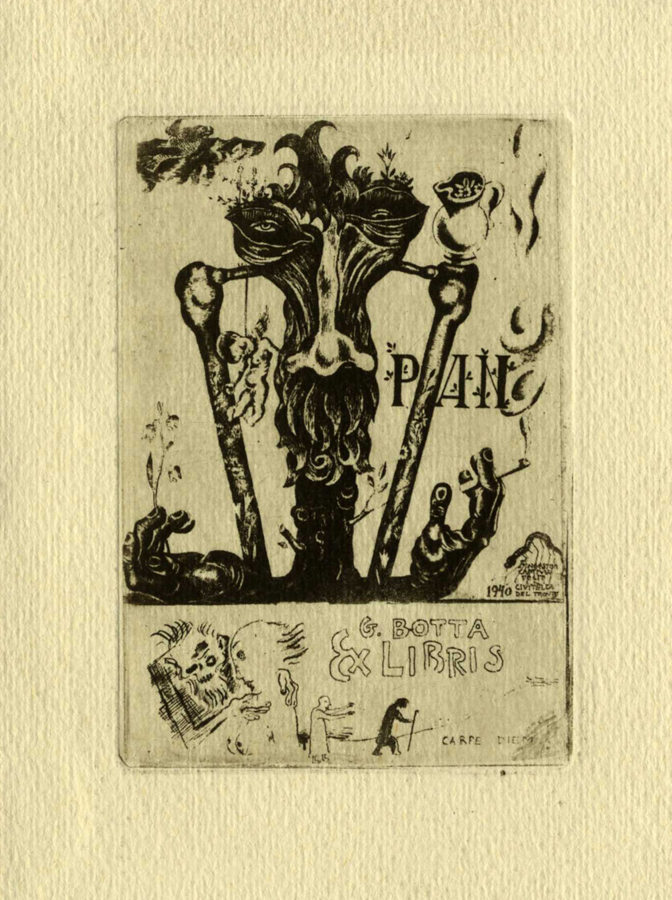 Michel Fingesten, Lotto composto di 2 ex libris a tema macabro. 1940-42. 1) Ex libris G. Botta. (Pan). 1940. Acquaforte. mm 85x55. foglio: mm 120x87. NECHWATAL, P. 51. Firma, titolo e data in lastra al margine destro. Opera con bellissima remarque al margine inferiore. 2) Ex bibliotheca Bellica G. Botta. Quo vadis paupere homo? 1942. Fotoincisione. mm 84x100. Foglio: mm 130x145. MIRABELLA-BARDAZZI-BALLERINI, 431. Titolo, firma e anno in lastra ai margini. (2)