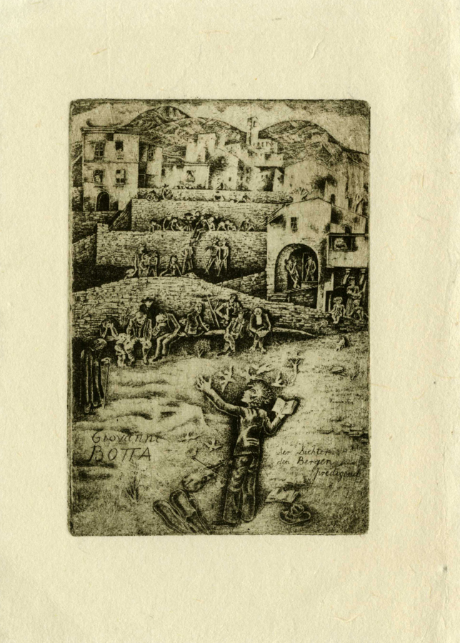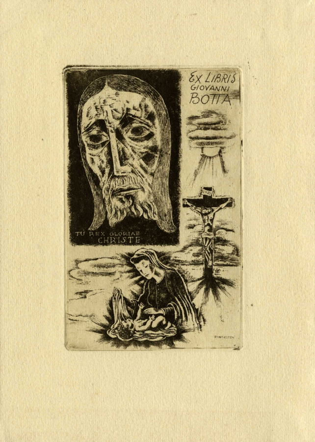 Michel Fingesten, Lotto composto di 3 ex libris. 1942. 1) [Ex libris] G[iovanni] B[otta]. 1942. Linoleografia. mm 112x85. Foglio: mm 142x100. MICHEL FINGESTEN EXLIBRISKUNST, 16. Firmata a matita in basso a destra, iscritto: "Handdruck" a matita in basso a sinistra. 2) Ex libris Giovanni Botta. Tu Rex Gloriae Christe. Fotoincisione. mm 117x65. Foglio: mm 173x125. MIRABELLA-BARDAZZI-BALLERINI, 261. 3) Ex libris giovanni Botta. Der Dichter den Bergen predigend. Fotoincisione. mm 115x80. Foglio: mm 175x130. MIRABELLA-BARDAZZI-BALLERINI, 422. (3)