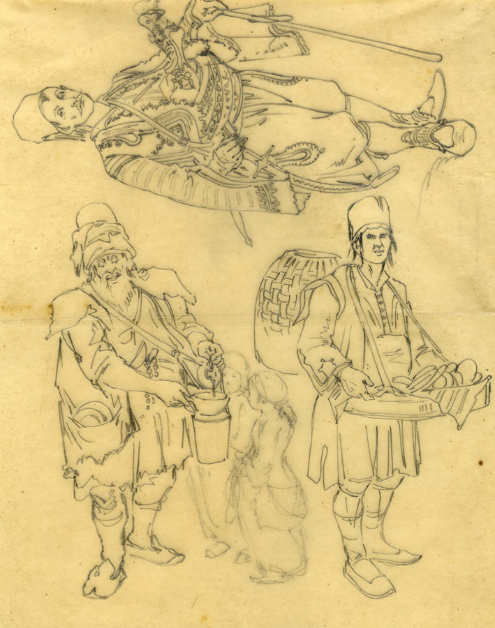 Amedeo Preziosi, Venditore d'acqua; Albanese; Venditori di dolci. 1862-70. Matita su carta lucida. mm 300x236. LEONE, 163. Tre meravigliosi studi di figure orientali dal tratto pulito e chiaro. Provenienza: Galleria Alessandra Di Castro Antiques a Roma. (1)