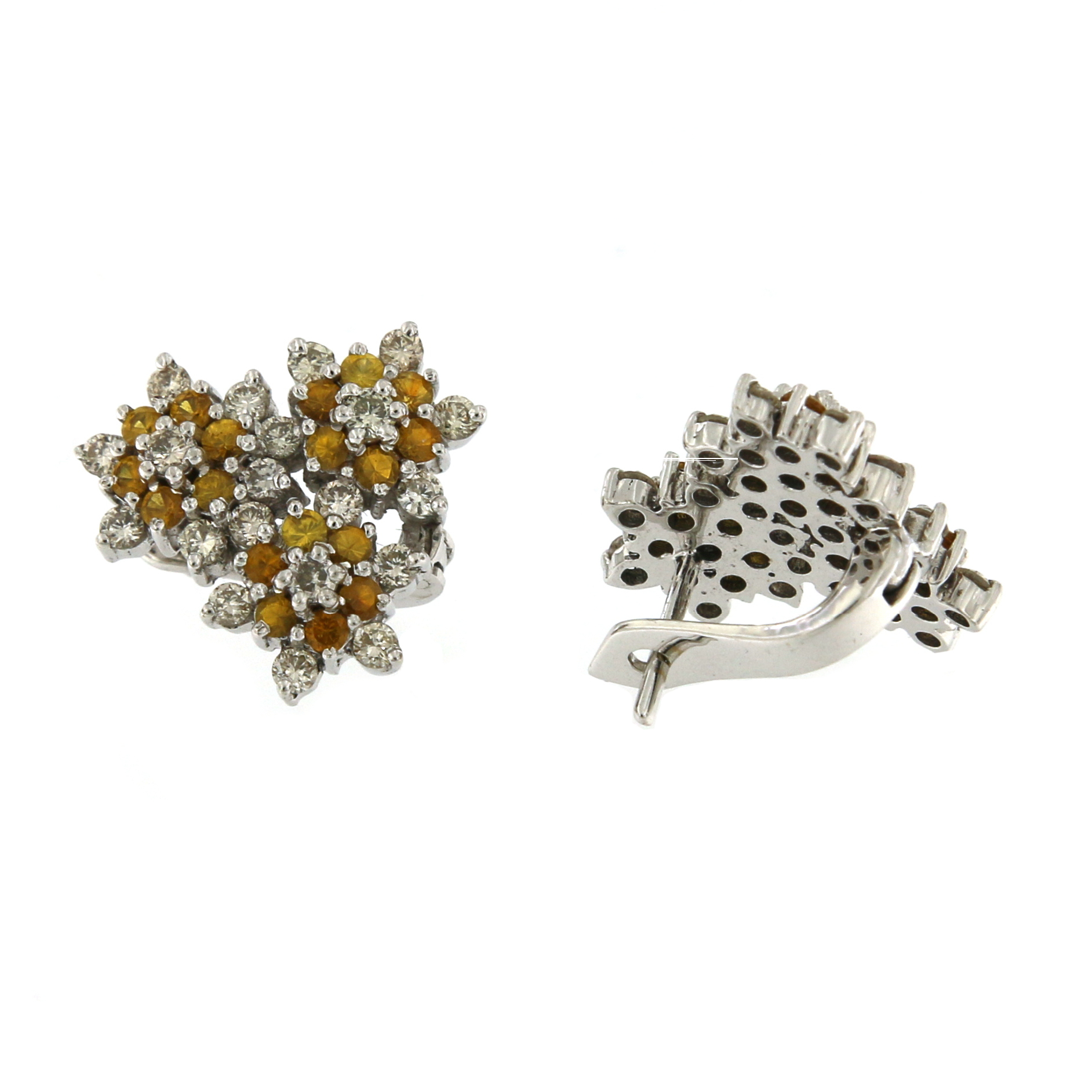 Orecchini con diamanti e zaffiri gialli in oro bianco 18 kt, con diamanti taglio a brillante per complessivi ct 1,20 ca e zaffiri gialli per complessivi ct 1,30 ca, lunghezza cm1.5, grammi 8.10