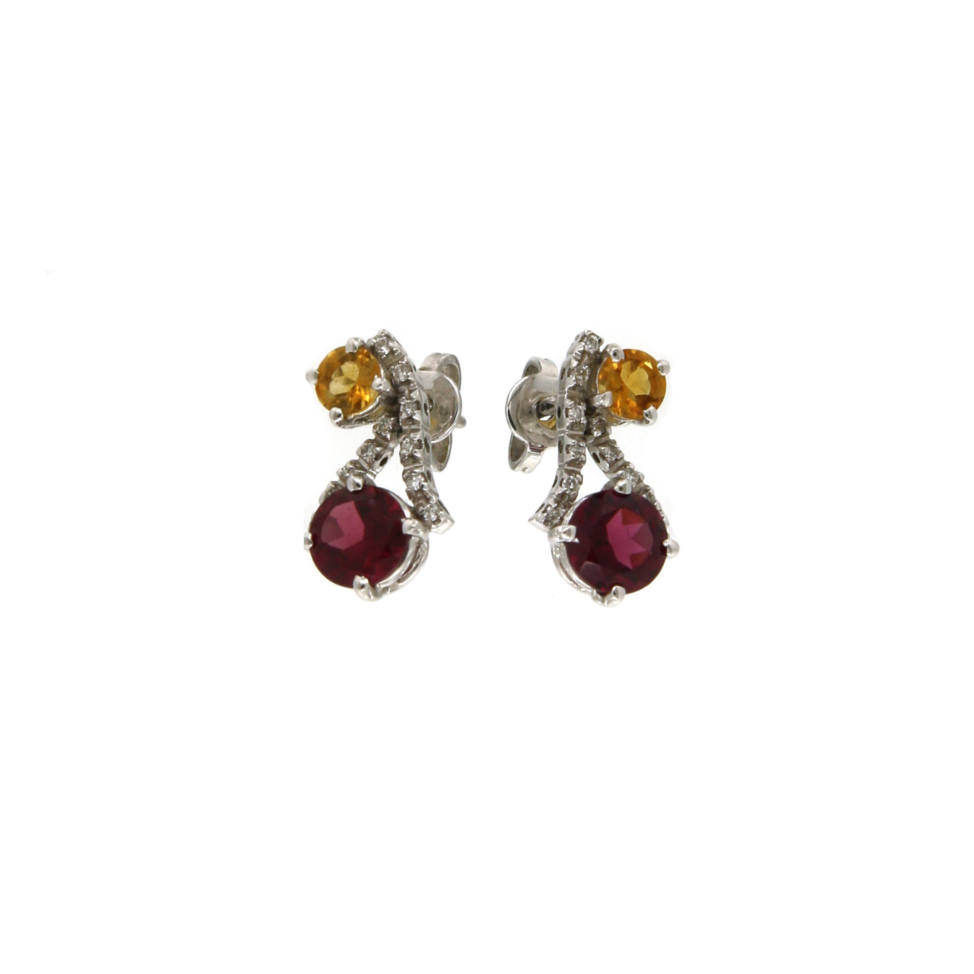 Orecchini con diamanti e pietre in oro bianco 18 kt, con rodolite e quarzo madera e diamanti per complessivi ct 0,15 ca, lunghezza cm 1.6, grammi 3.40