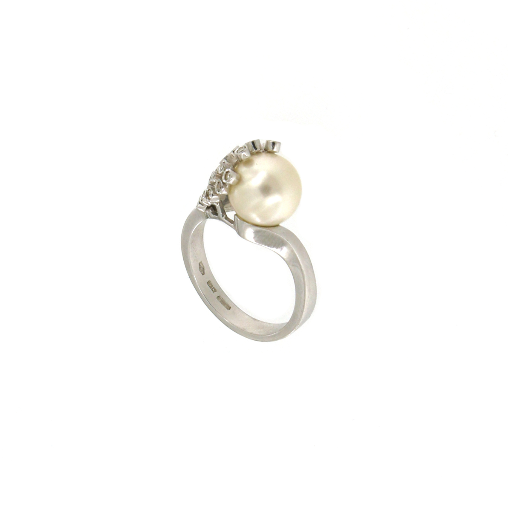 Anello perla e diamanti in oro bianco 18 kt con perla coltivata diametro 9 - 9 1/2 e diamanti per complessivi ct 0,12 ca, misura 54, grammi 6.20