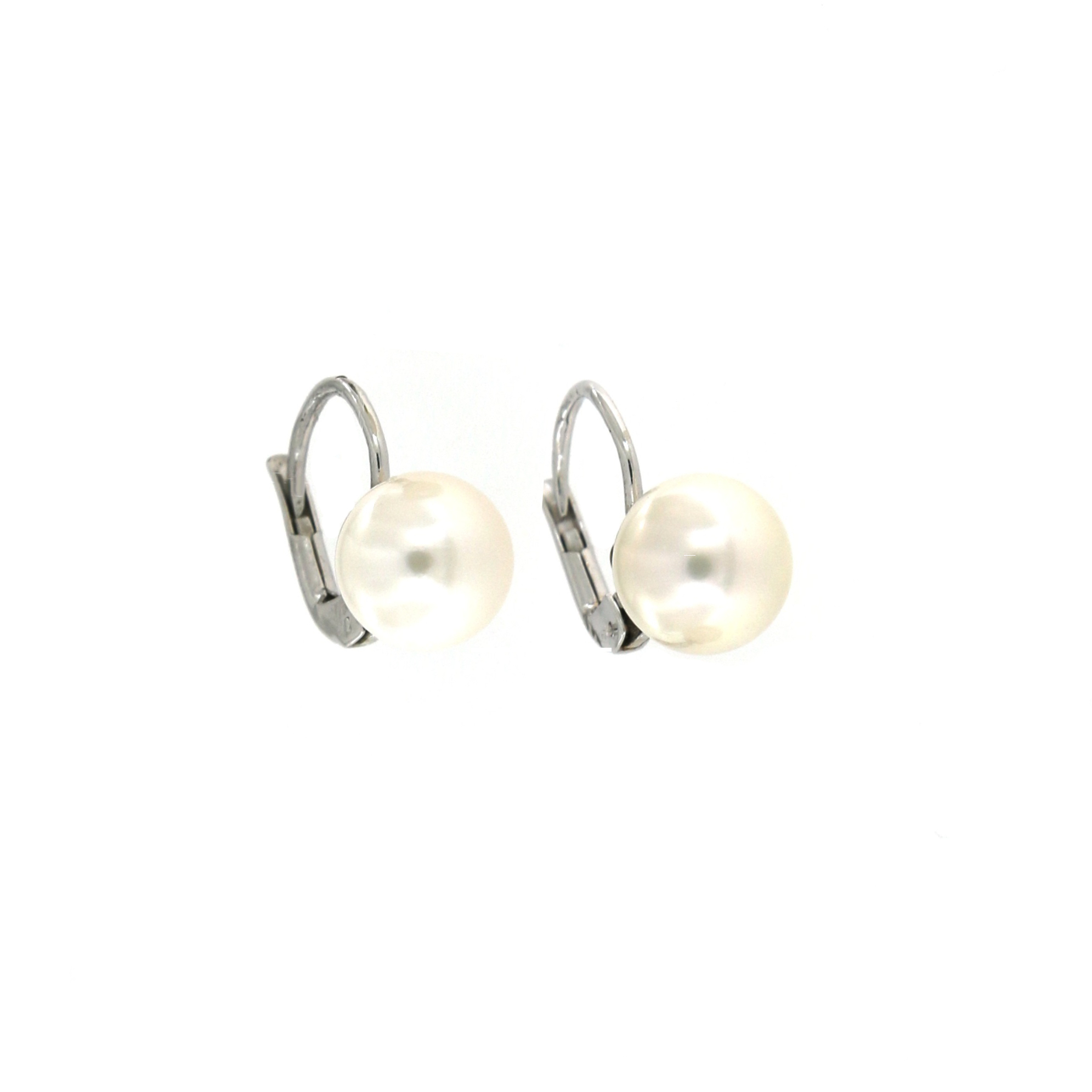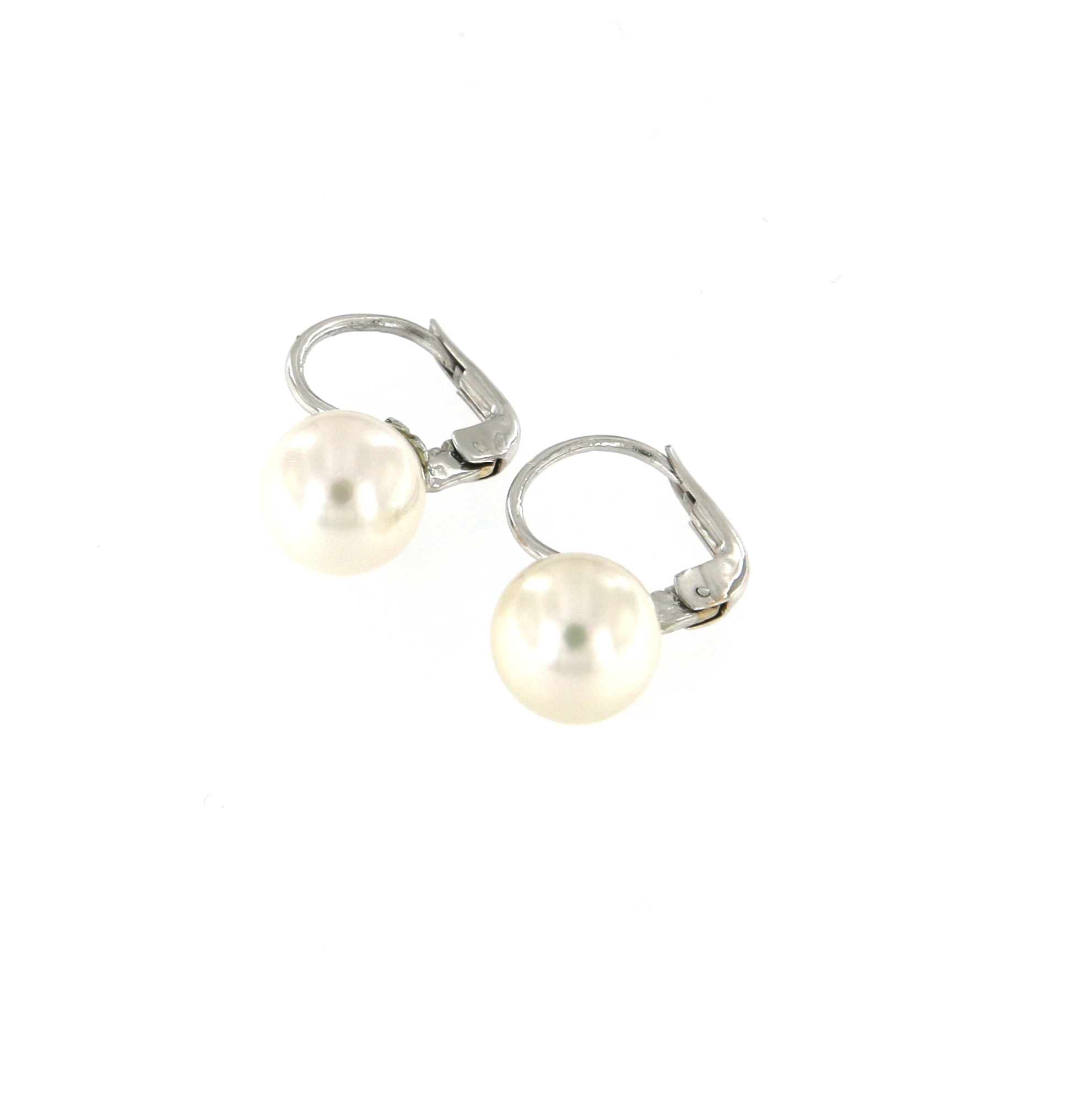 Orecchini monachella con perla in oro bianco 18 kt con perla coltivata 8 1/2 ca, lunghezza cm 1, grammi 3.10