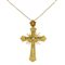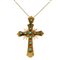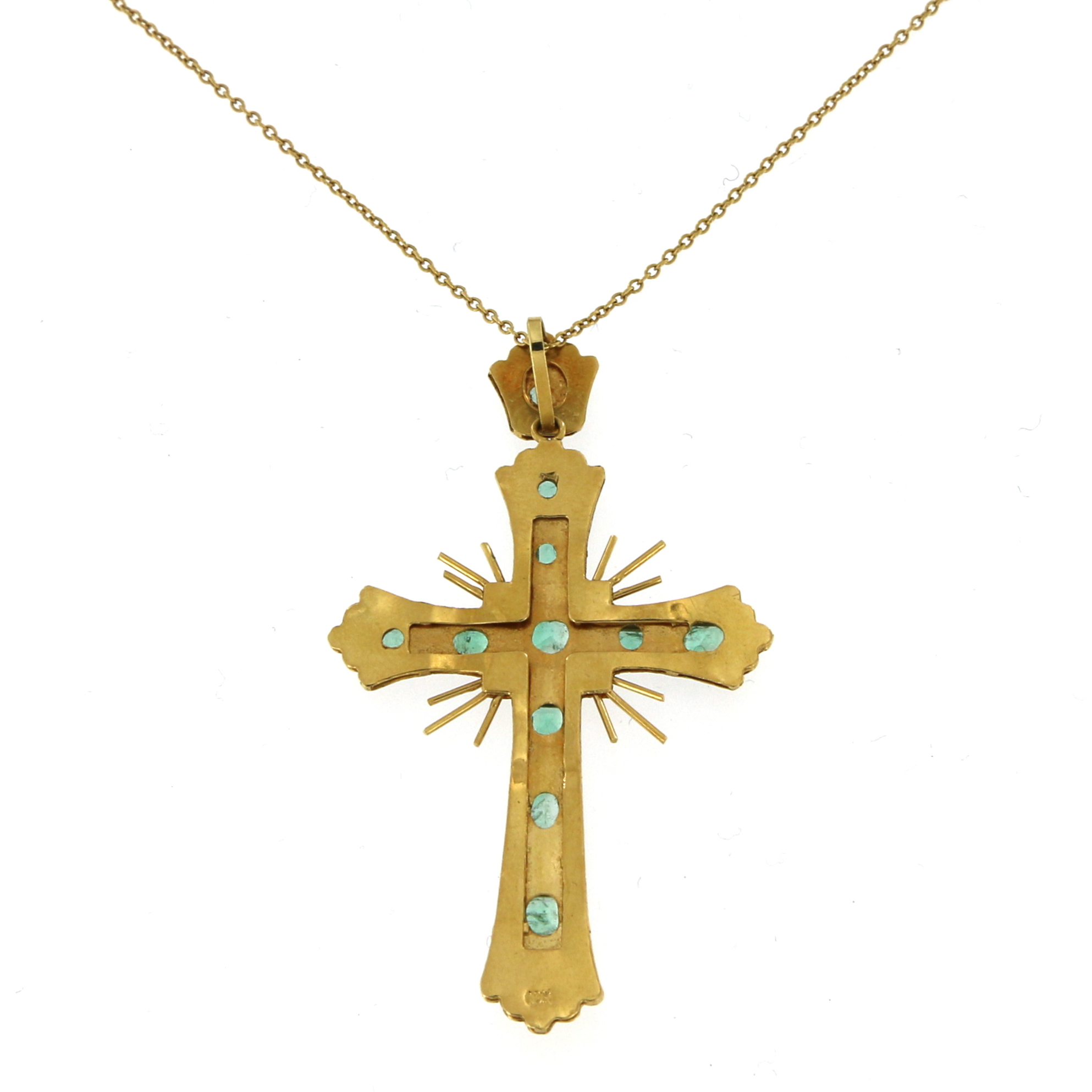 Collana croce in oro giallo 18 kt con undici smeraldi taglio a gradino per complessivi ct 1,50 ca, lunghezza croce cm 6, lunghezza totale cm 42, grammi 6.20