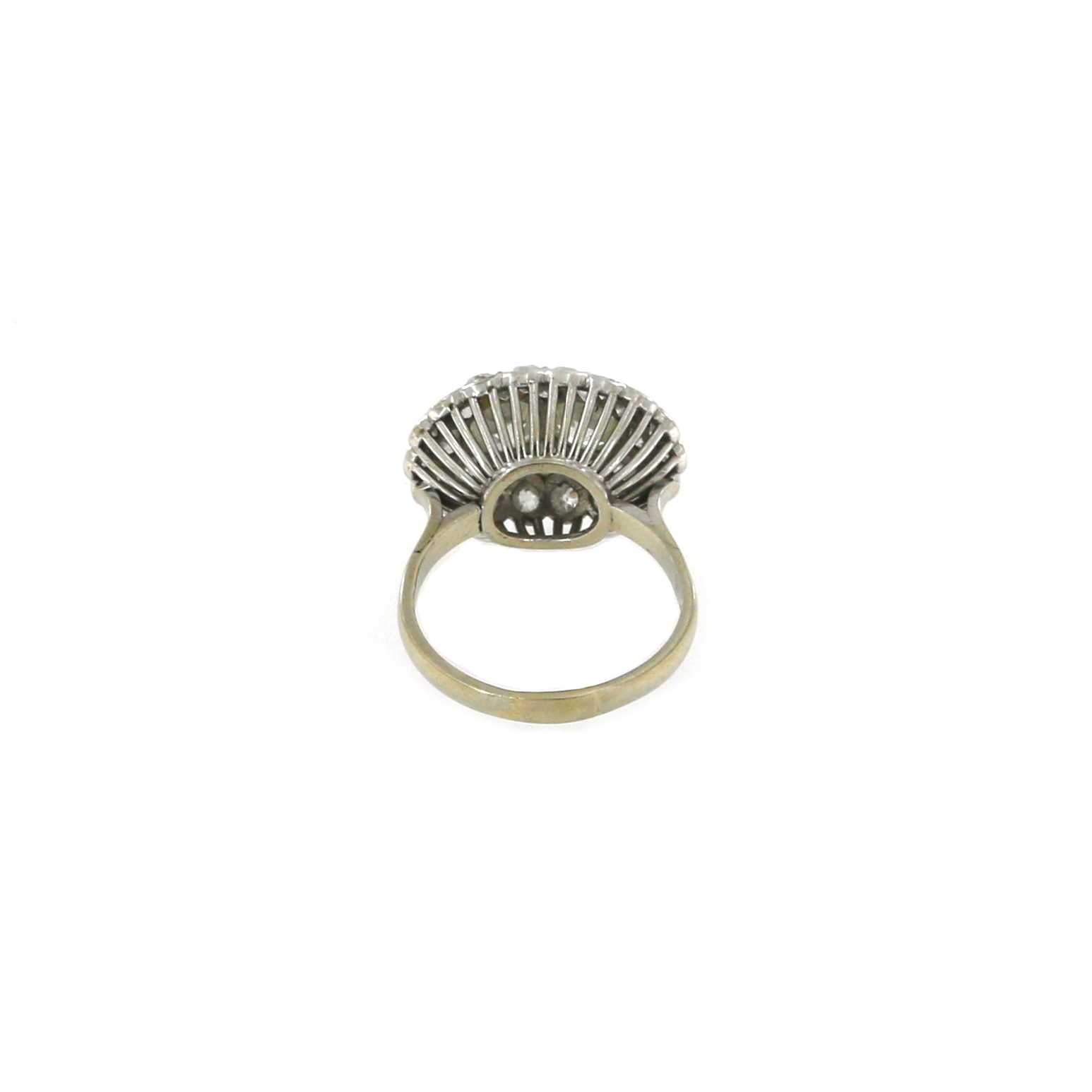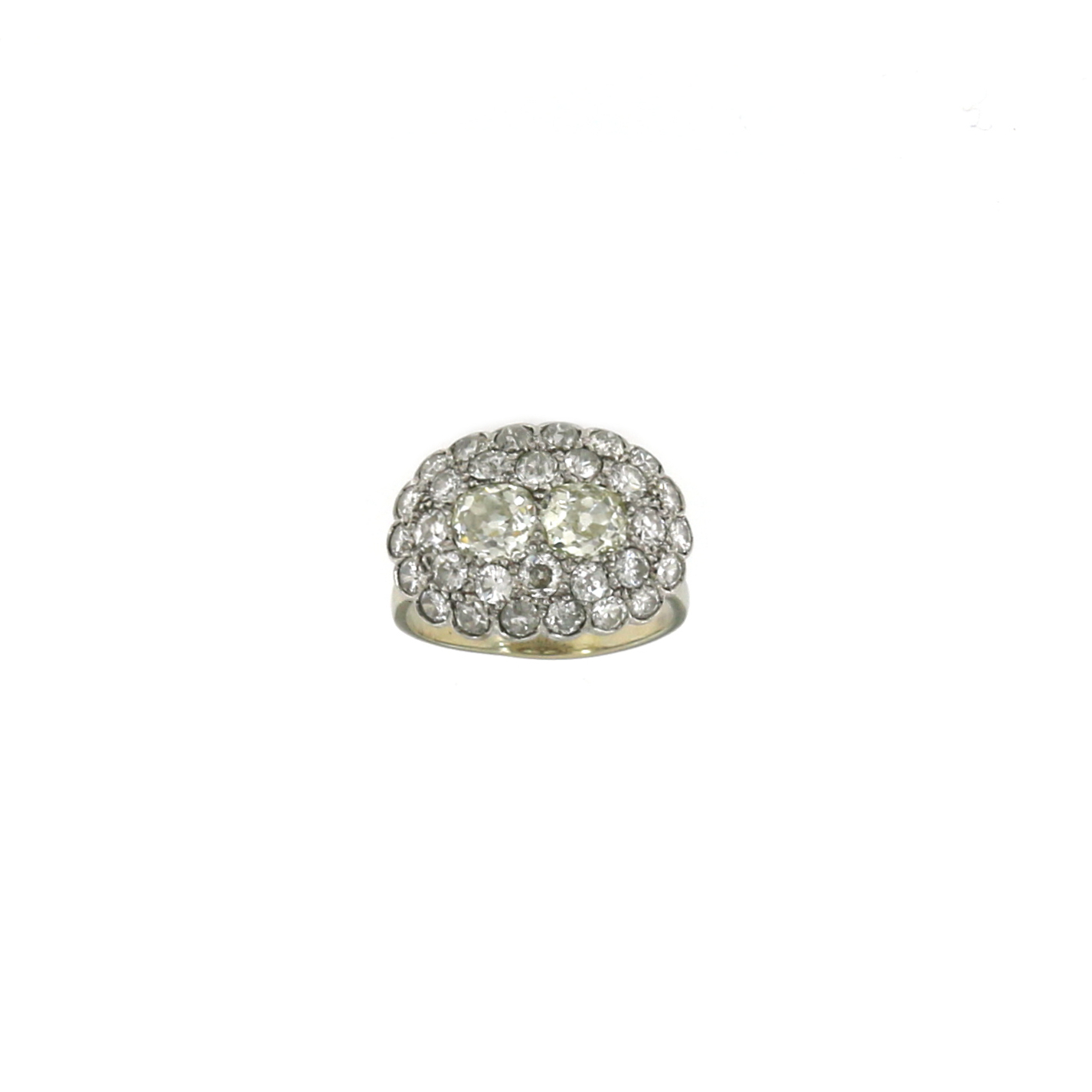 Anello diamanti in oro bianco 18 kt con due diamanti taglio antico per complessivi ct 1,00 ca e diversi diamanti taglio antico per complessivi ct 1,60 ca, misura 55, grammi 5.50