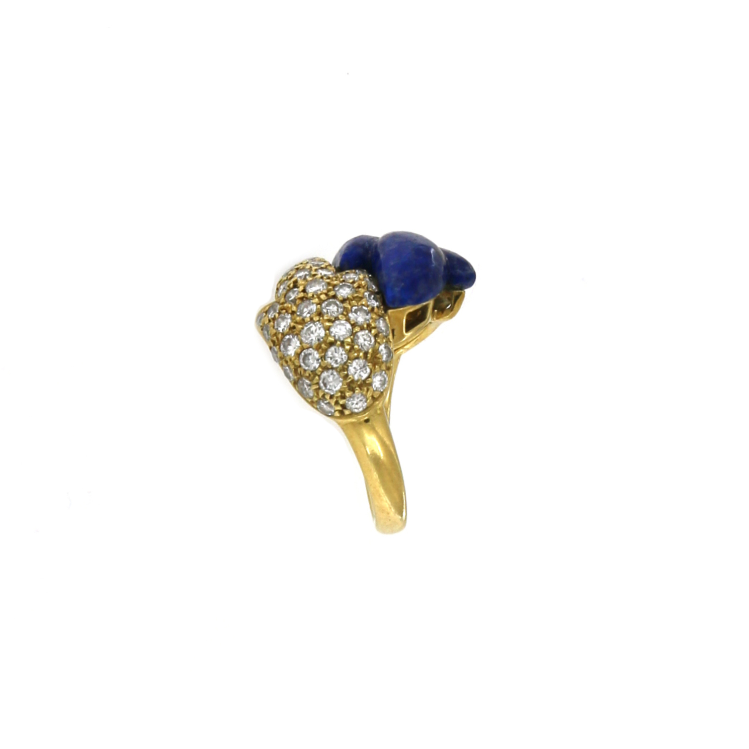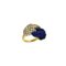Anello Lapis in oro giallo 18 kt con lapislazzuli intagliato a forma di foglia e diamanti taglio a brillante per ct 1,30, misura 53, grammi 10.40