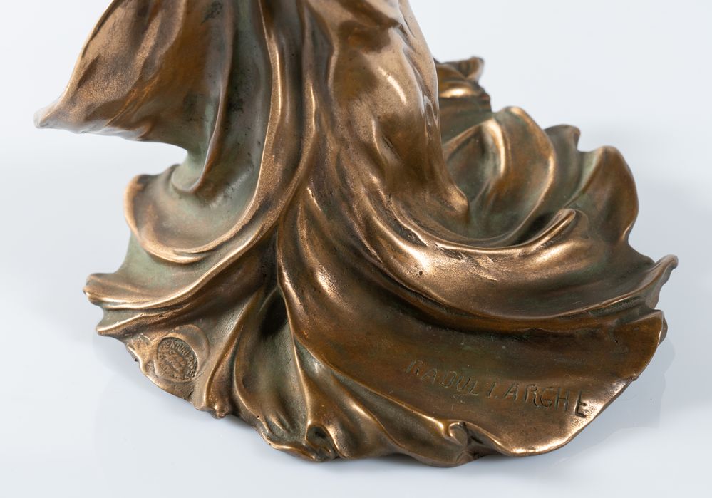 RAOUL FRANCOIS LARCHE (1860-1912) "Loïe Fuller". Scultura lampada in bronzo dorato a cera persa. Cm 33x17.5x14. Opera firmata alla base Raul Larghe. Alla base reca timbro della fonderia Venturi Arte.