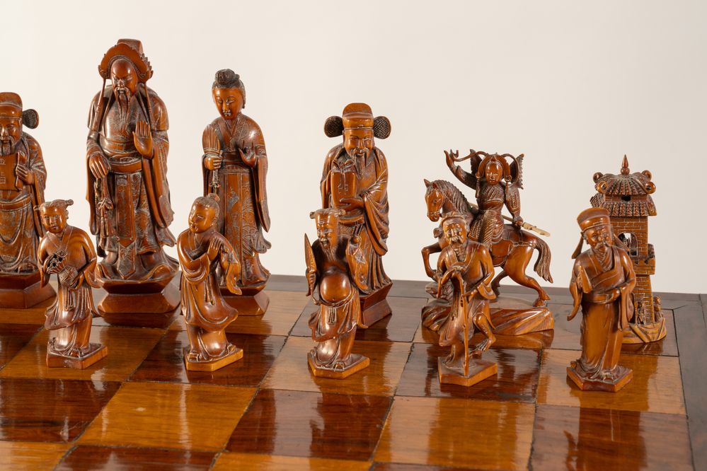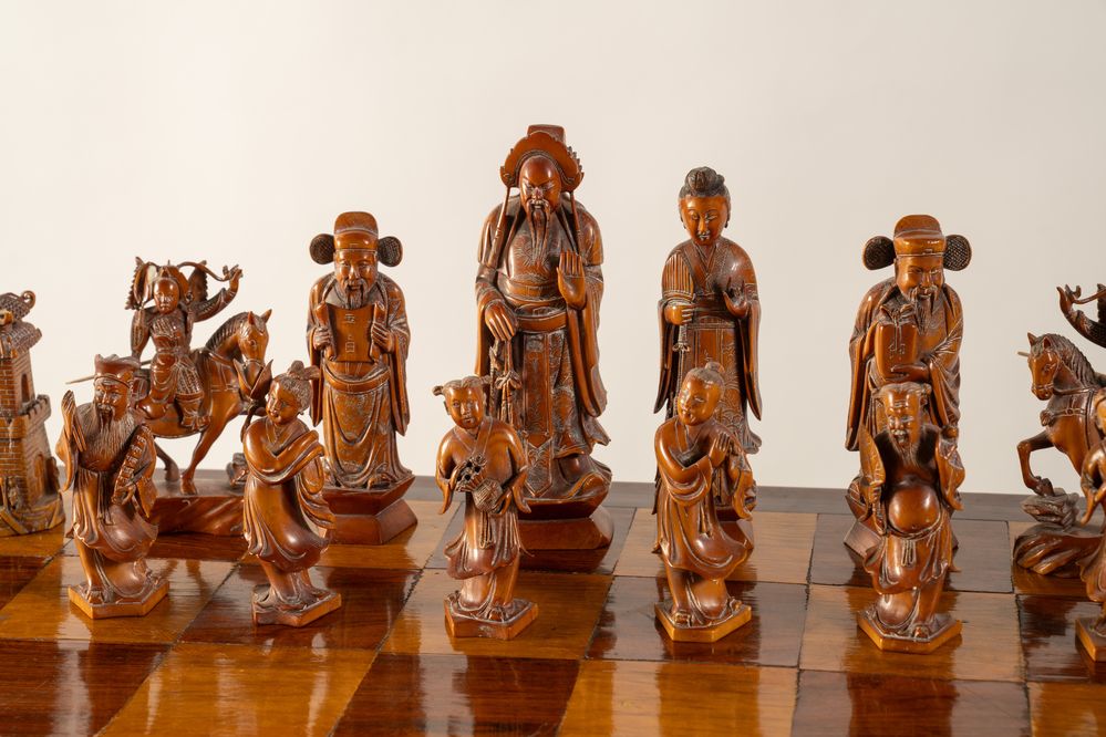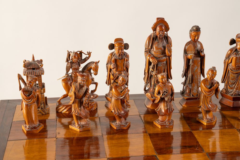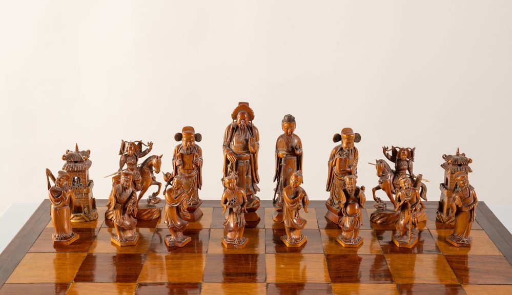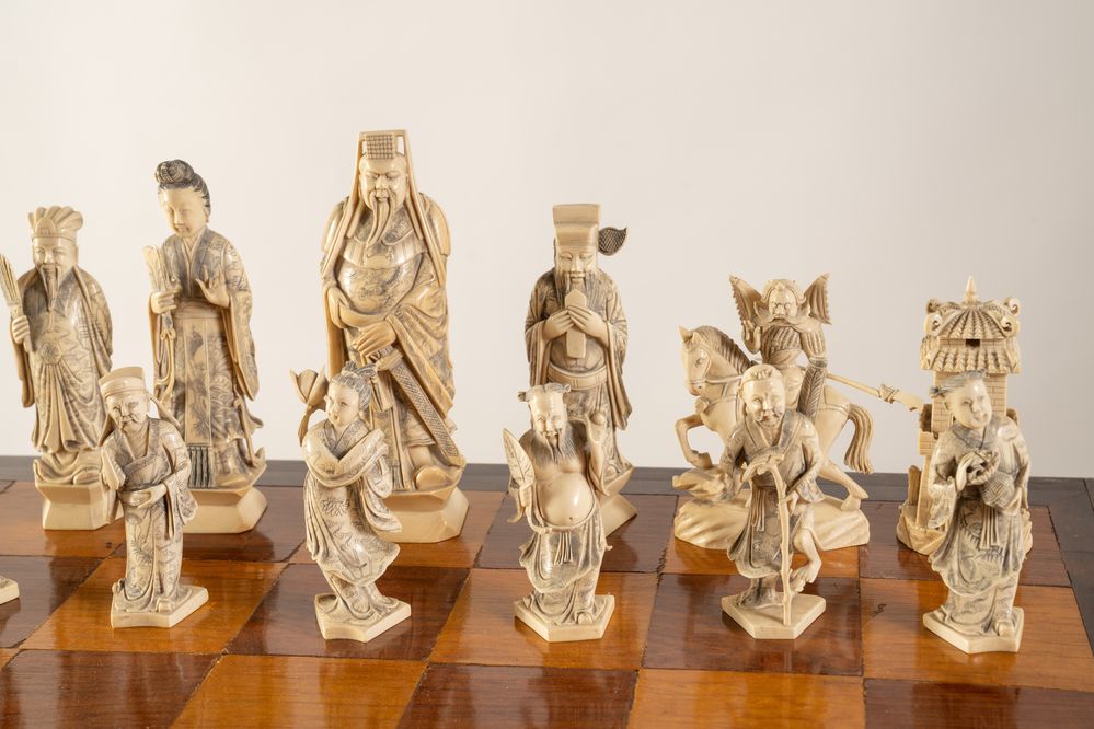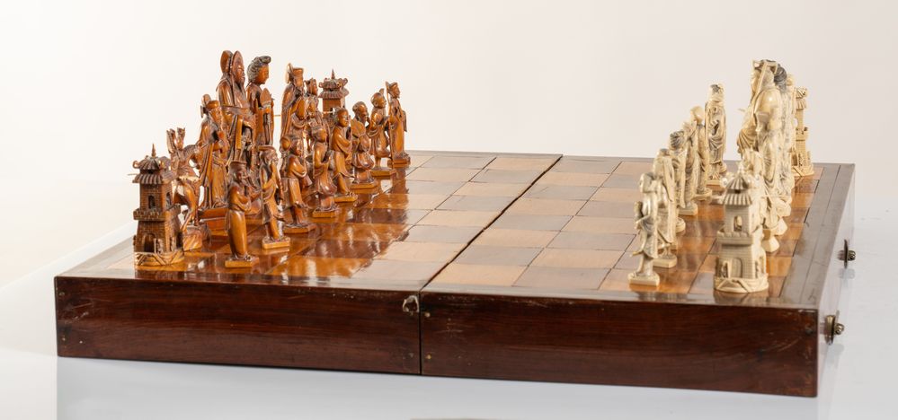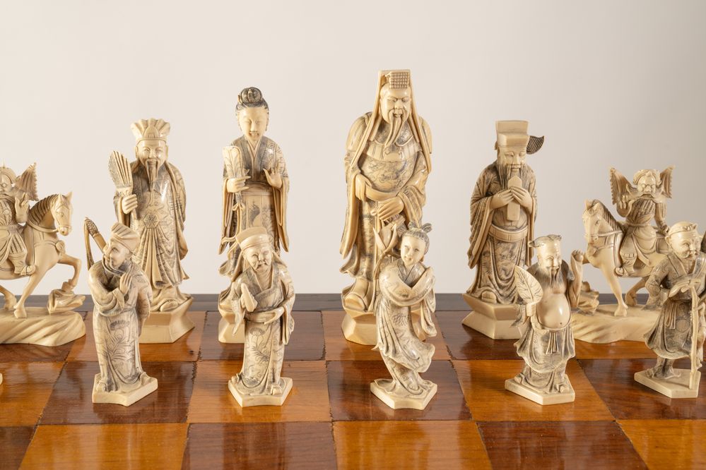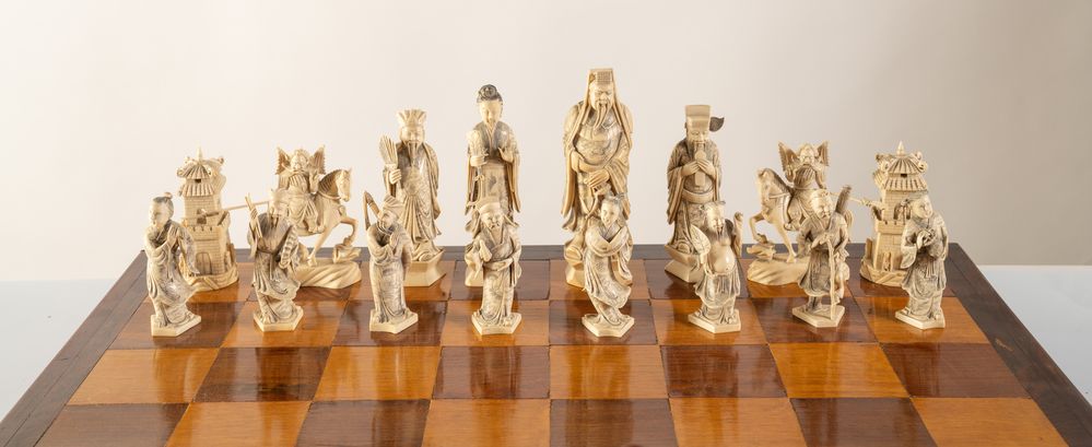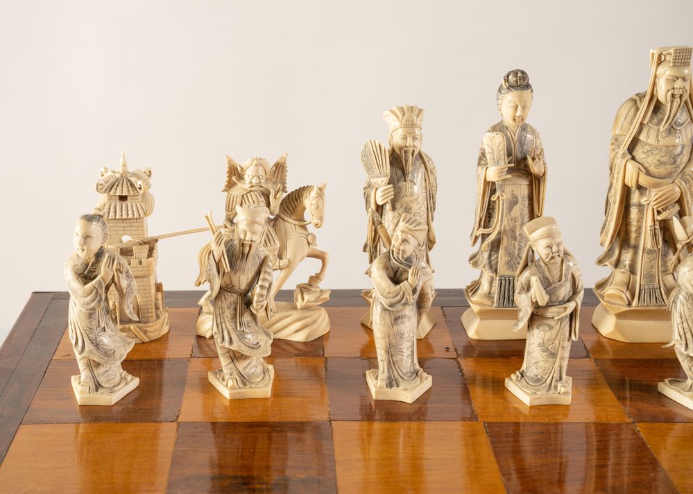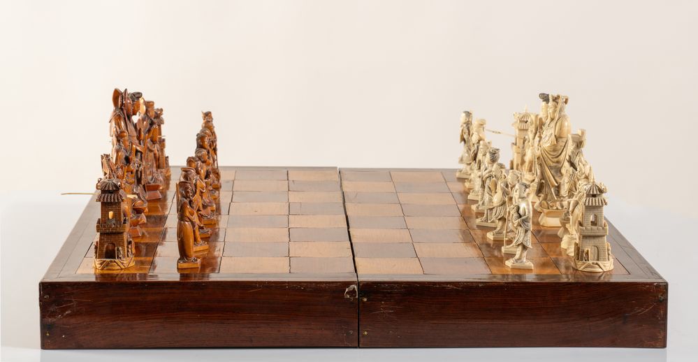 Scacchiera. Cina, anni '40 del XX secolo. Recante figure in avorio e avorio...