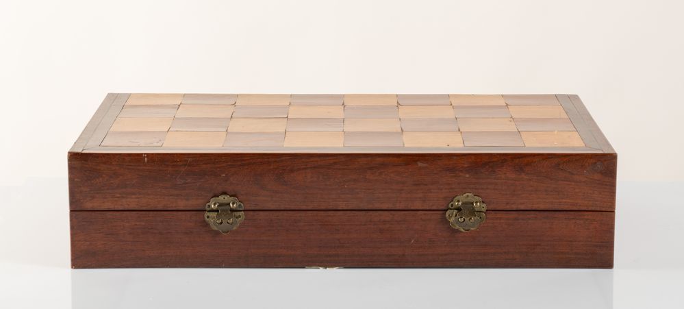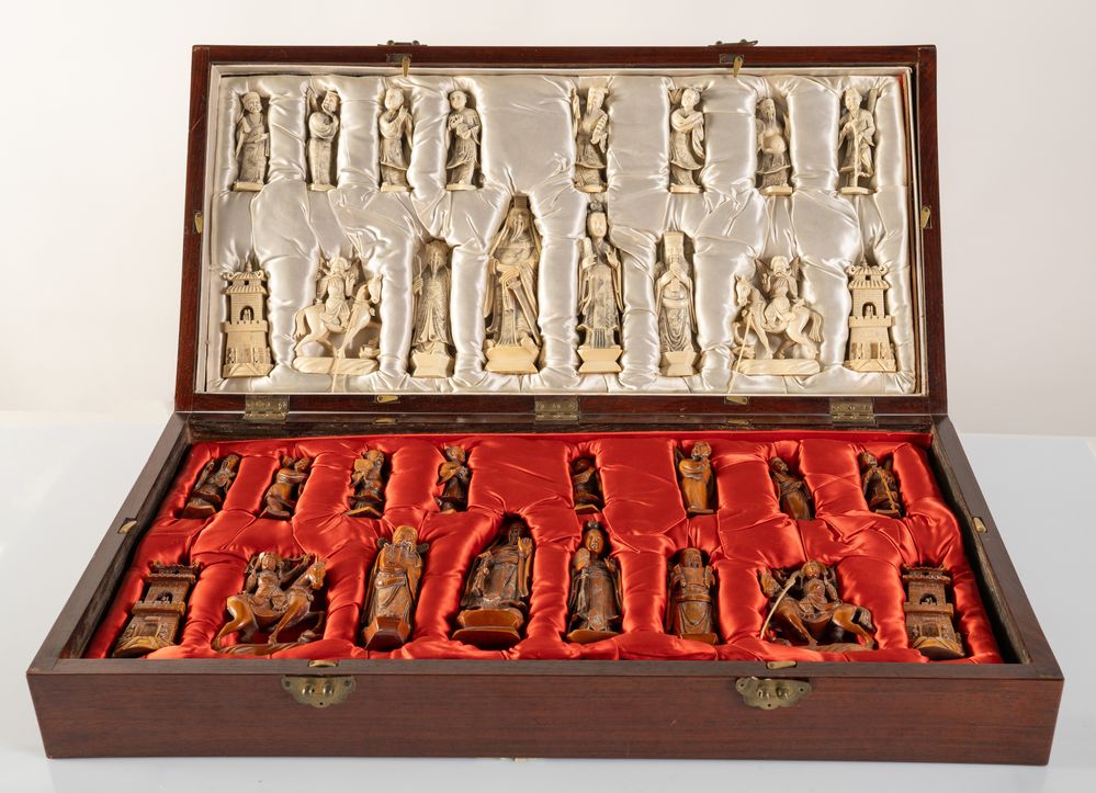 Scacchiera. Cina, anni '40 del XX secolo. Recante figure in avorio e avorio tinto. Lotto accompagnato da certificato CITES.