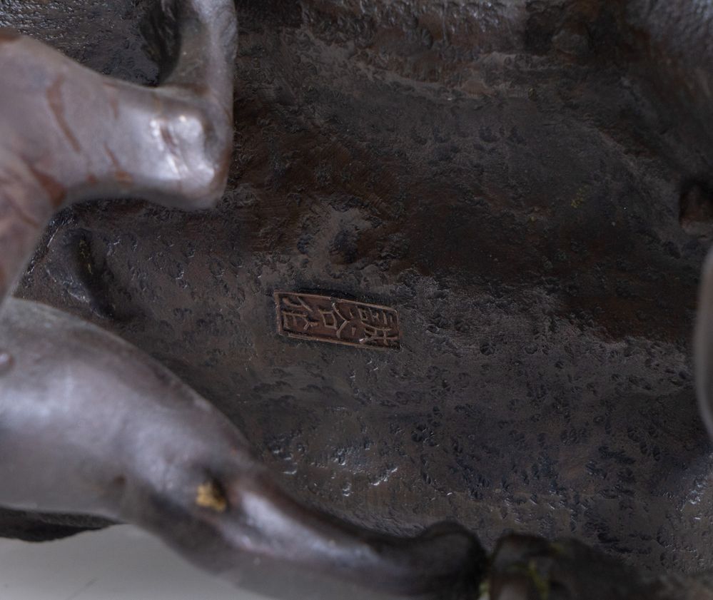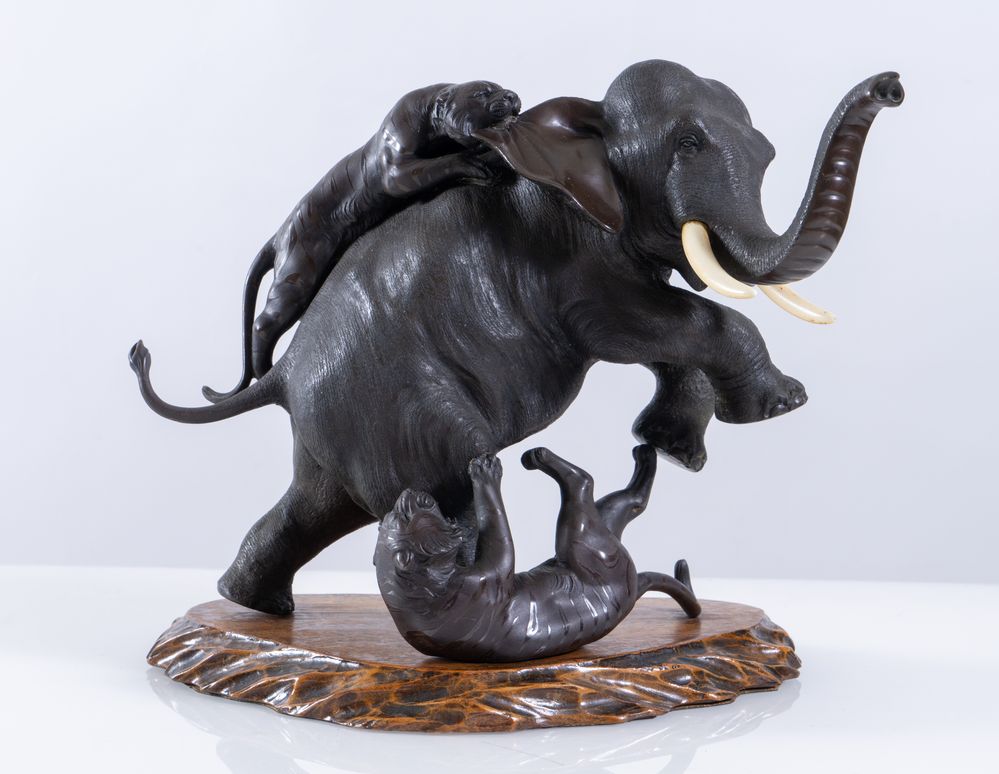 GENRYUSAI SEIYA (epoca Meiji (1868-1912), fine XIX/inizio XX secolo) "Elefante attaccato da due tigri". Okimono in bronzo. Cm 27,3x33,4x20,7. Opera firmata sul ventre dell'elefante in caratteri tensho Genryusai Seiya Tsukuru all'interno di un sigillo quadrato.