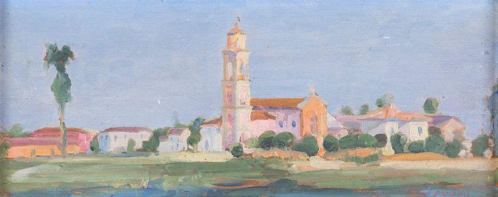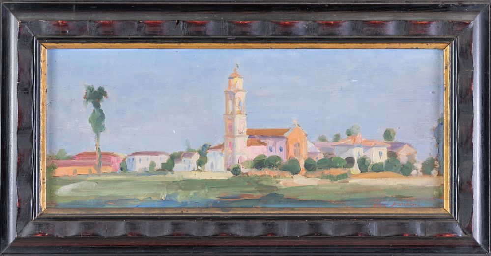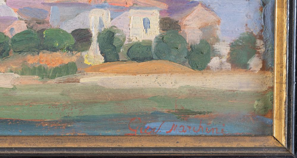GIOVANNI MARCHINI (Forlì 1877 - 1946) Olio su tavoletta. Cm 16x39,5. Opera firmata in basso a destra Giov. Marchini.