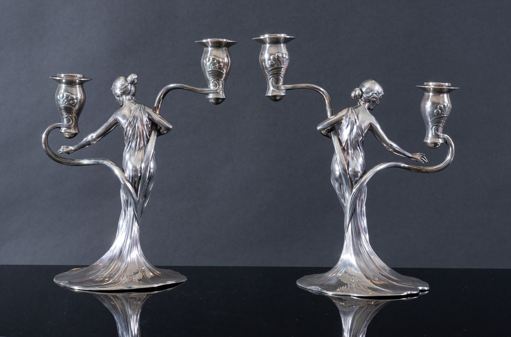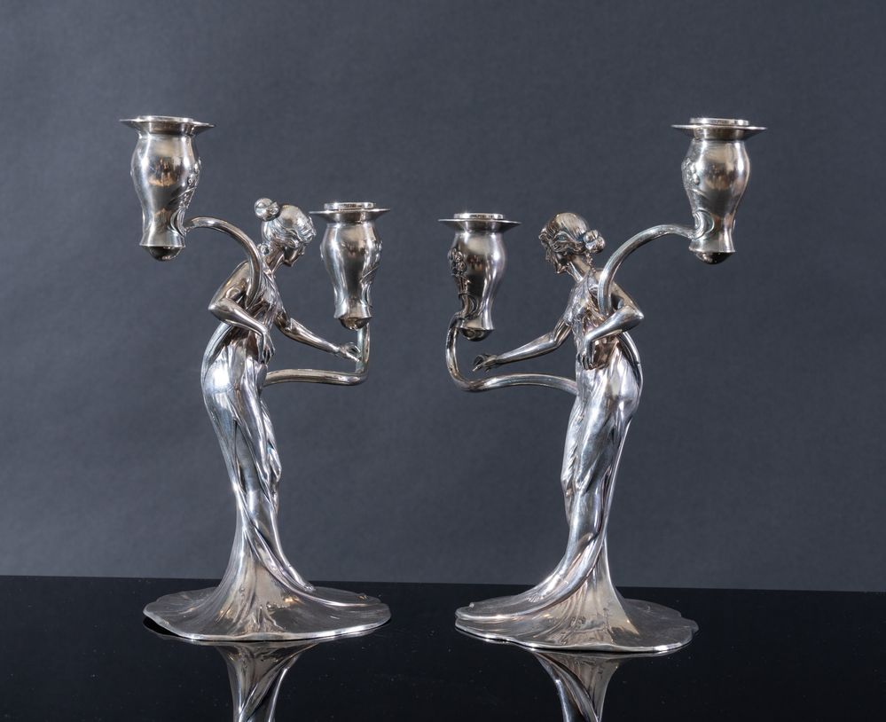 Württembergische MetallwarenFabrik, Geislingen, 1900 ca. Coppia di candelabri...