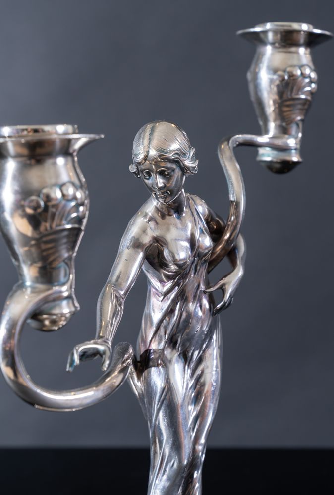 Württembergische MetallwarenFabrik, Geislingen, 1900 ca. Coppia di candelabri in silver-plate, modelli n. 269/2 e 269a/2. Nel fusto recano figura femminile reggente due portacandele. Cadauno di cm 26xdiametro 21.5. Sotto la base recano punzoni WMF.