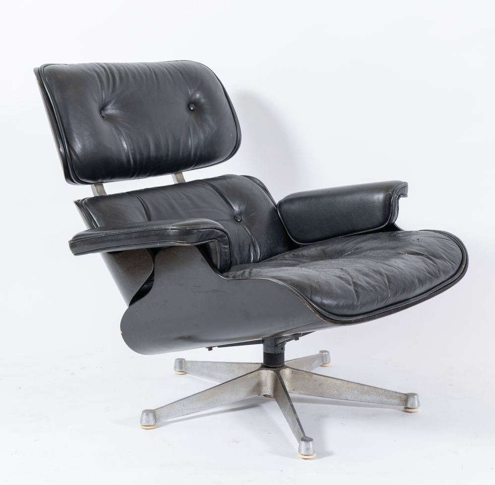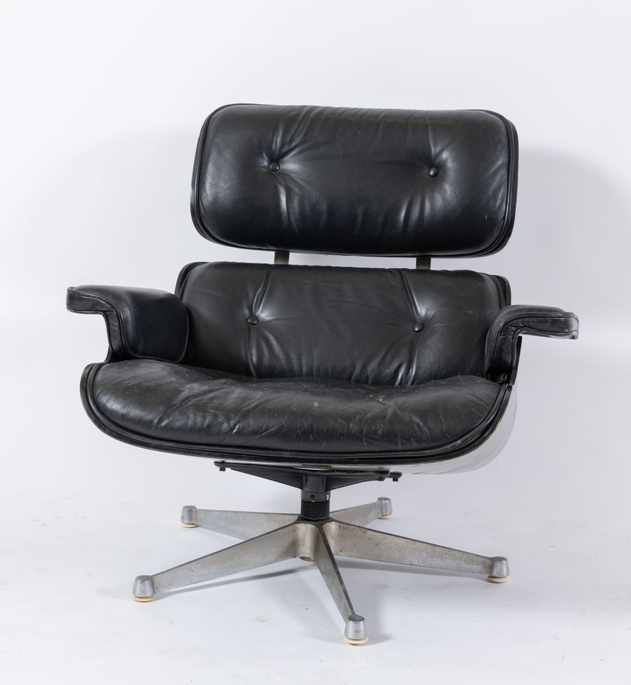 HERMAN MILLER Poltrona, modello 670 in palissandro scuro e pelle nera (1950 - 1959). Prod. Herman Miller, Stati Uniti, 1950s. Poltrona: cm 77x83x66. H cm seduta 39. (difetti)