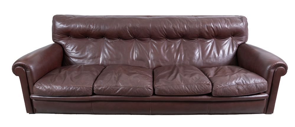 POLTRONA FRAU Divano in pelle marrone. Cm 82x252x84. Reca etichetta sotto la base.