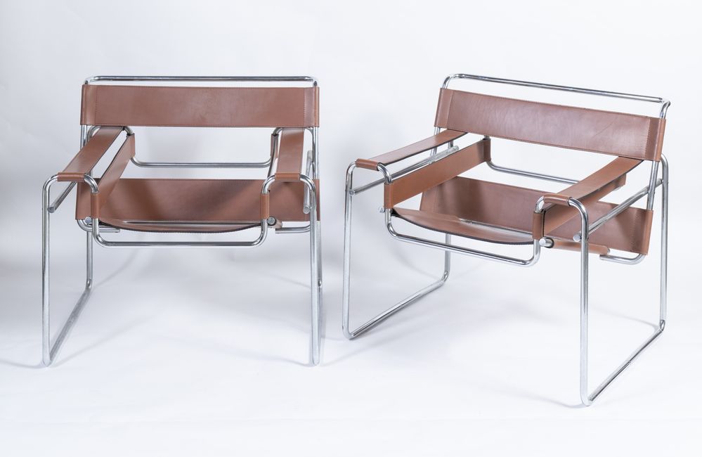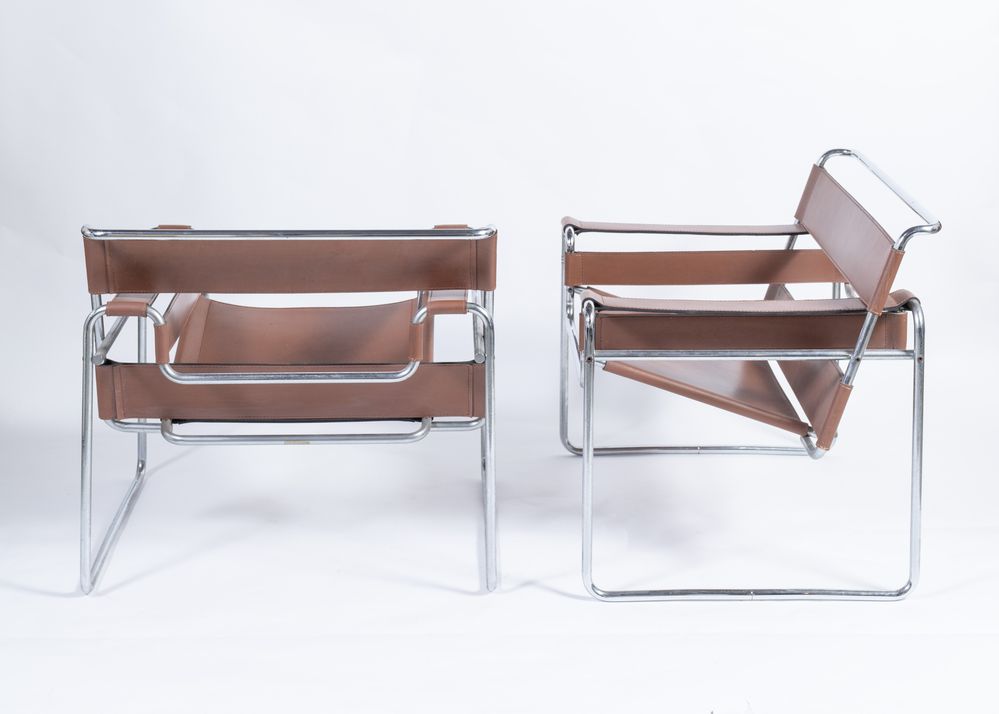 MARCEL BREUER Coppia di sedie, modello Wassily B3 (1925) con struttura in metallo e pelle marrone. Prod. Gavina, Italia, 1960s. Cadauna di cm 73x77x68.