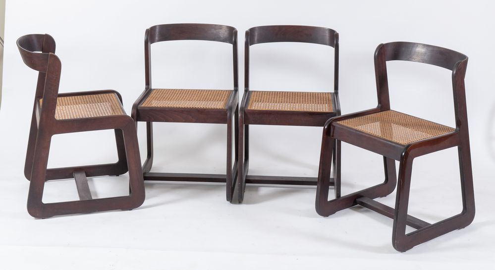 WILLY RIZZO Quattro sedie in legno massello di noce e seduta in rattan. Prod. Mario Sabot, Italia, 1970s. Cm 73x46x42.