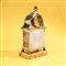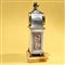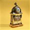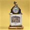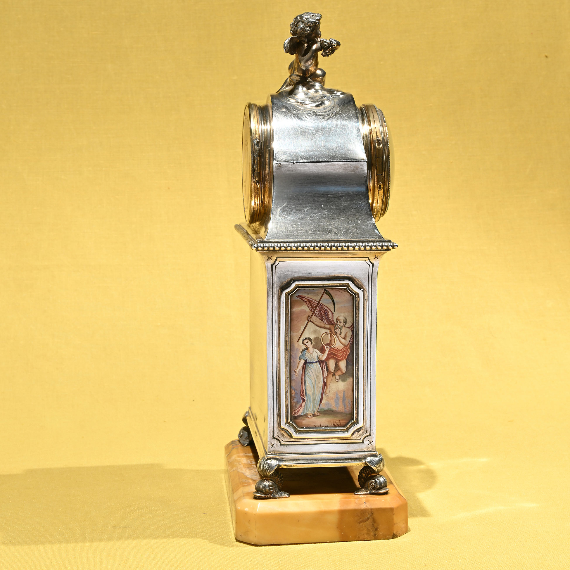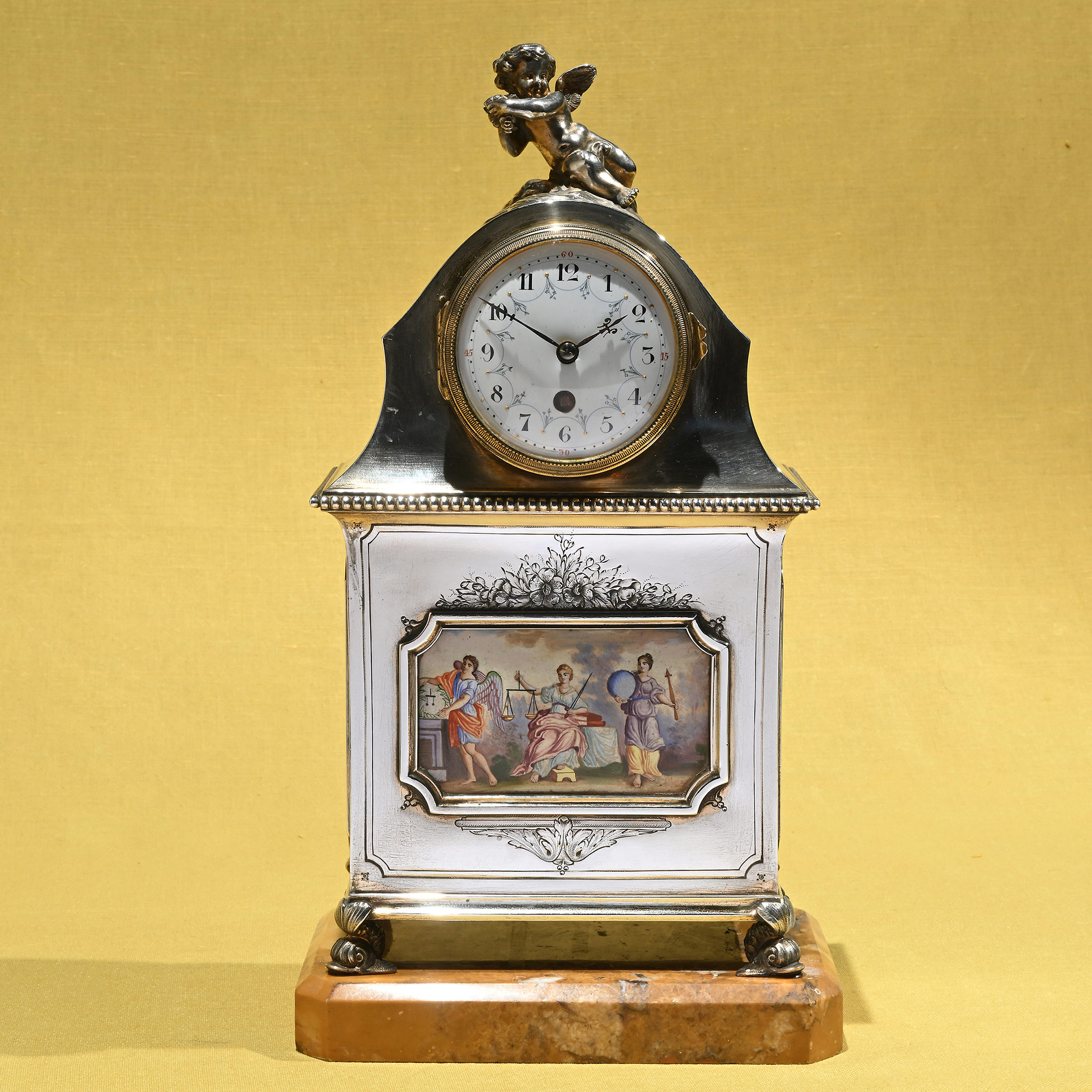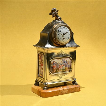 Orologio in argento e smalti, Austria XIX secolo Posto su lastra in pietra dura e quattro peducci pesciformi, l'orologio è sormontato da un putto e decorato da tre placche decorate a smalto e raffiguranti allegorie. Dimensioni complessive 30x16x9,5 cm.