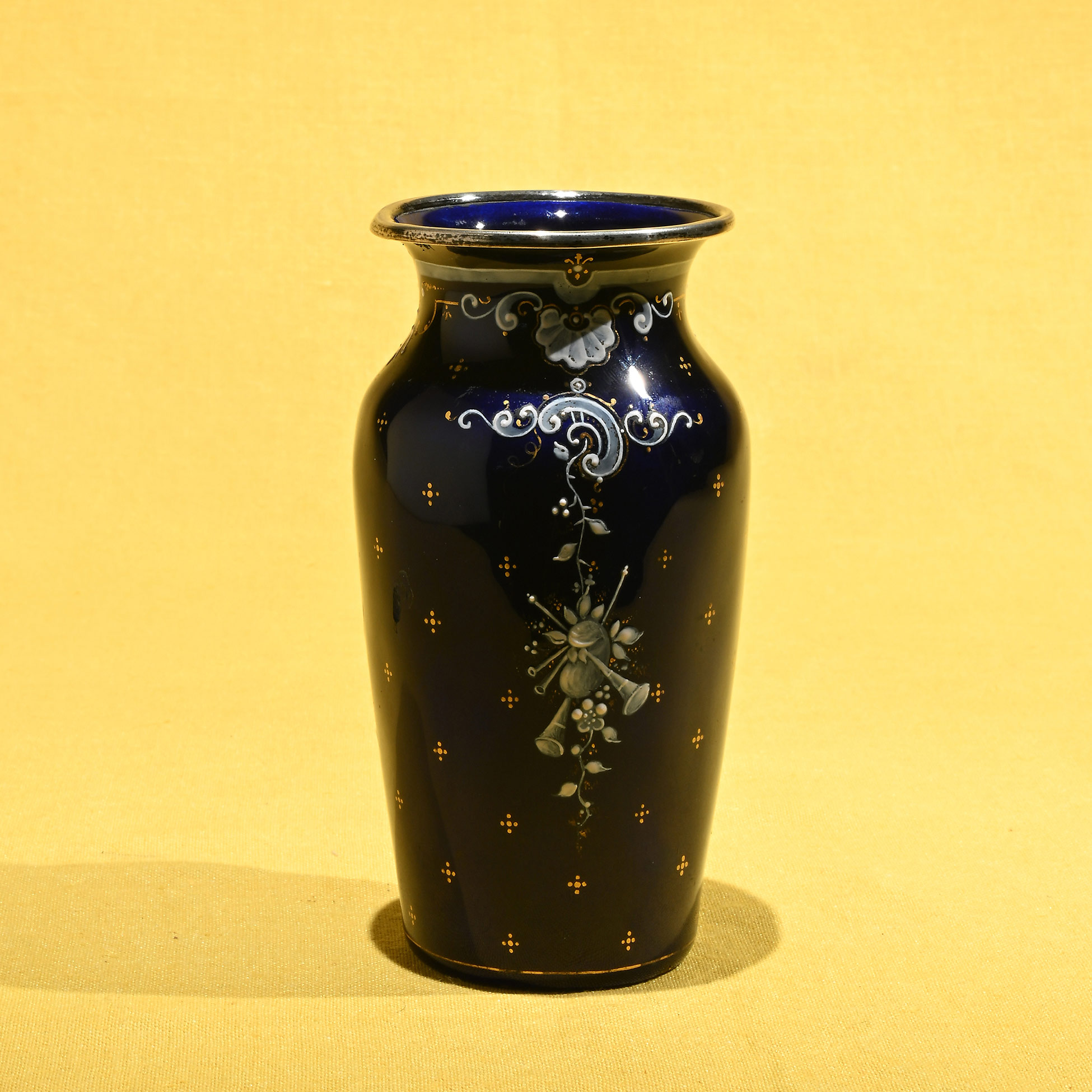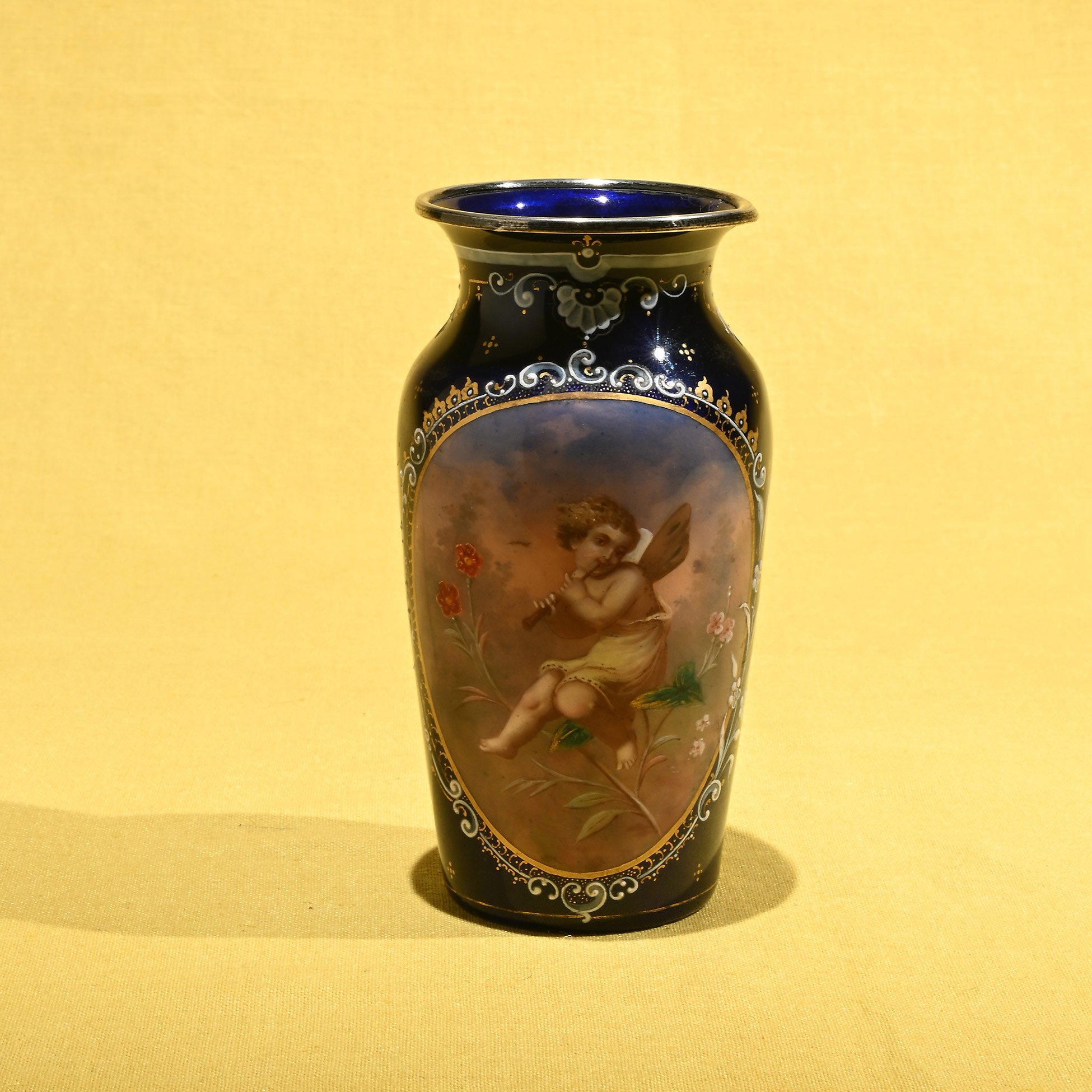 Vaso in smalto, Francia fine del XVIII secolo Decorato a motivi astratti e di festoni in bianco e oro su fondo blu e con ovale raffigurante un putto che suona il flauto. Dimensioni complessive 14x7x7 cm.