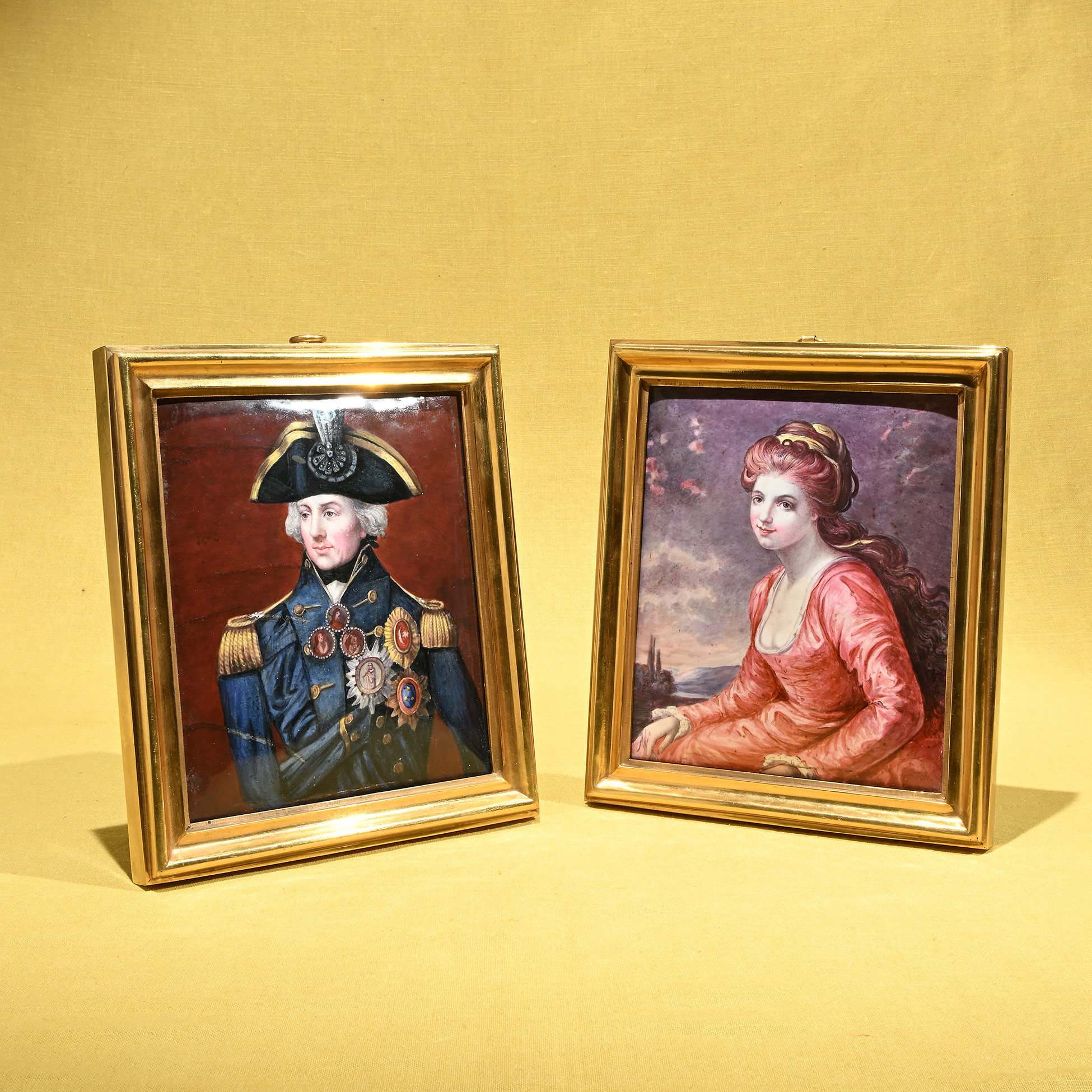 Coppia di placche in smalto, Inghilterra XIX secolo Gli effigiati sono rispettivamente l'ammiraglio inglese Horatio Nelson, duca di Bronte e Lady Hamilton. Dotate di cornici in bronzo dorato. Dimensioni complessive 21x18x1,5 cm. cad.