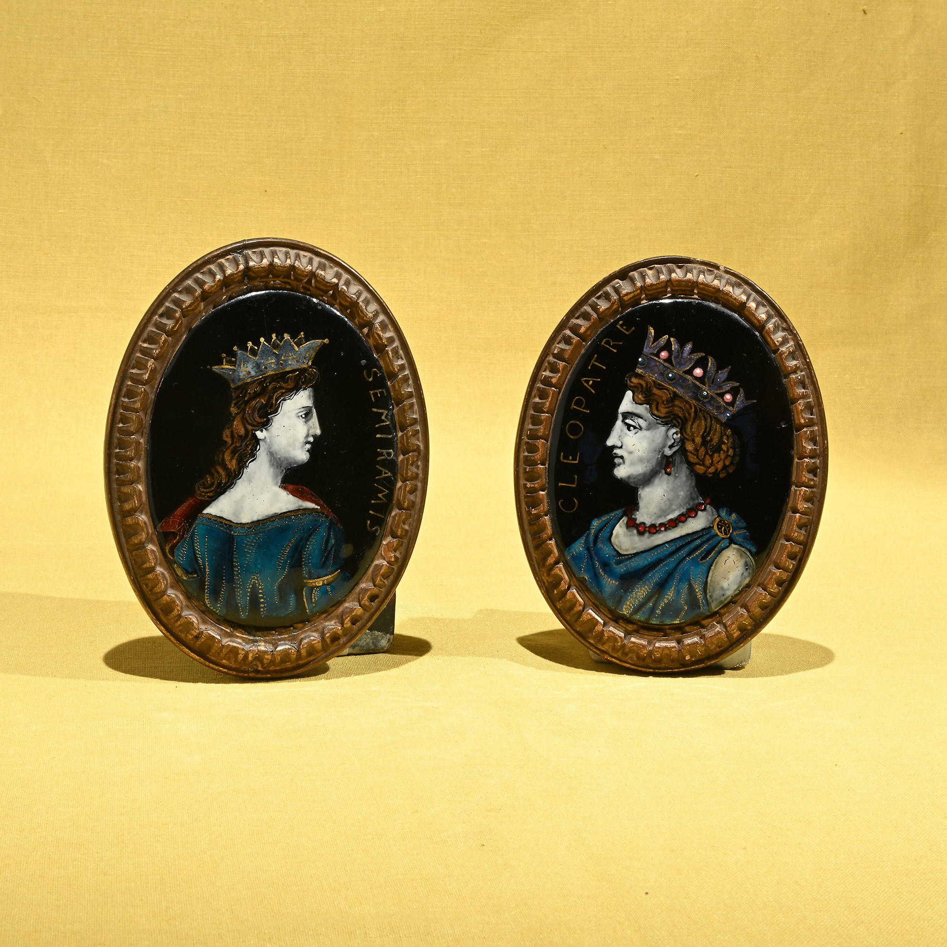 Coppia di placche in smalto, Limoges XVII secolo I soggetti rappresentati sono due grandi regine orientali dell'antichità: Semiramide e Cleopatra. Dimensioni complessive 15,5x11,5x1,5 cm. cad.