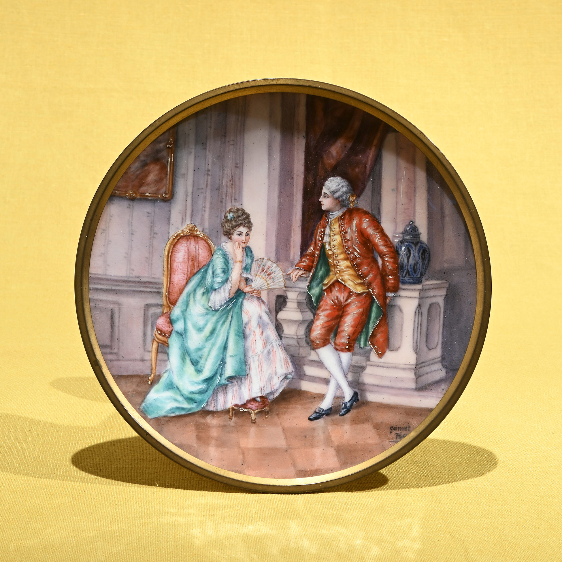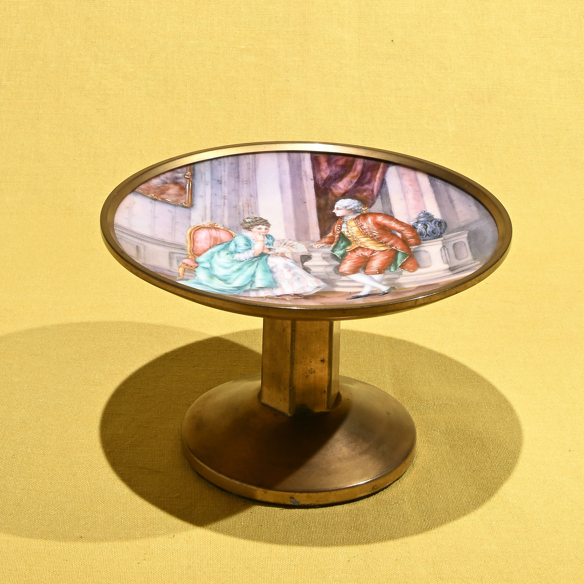 Alzata in bronzo e smalto, Francia XIX secolo Firmata in basso a destra 'Gamet (o Samet) France'. Nella raffigurazione centrale è rappresentata una scena galante. Dimensioni complessive 10x17x17 cm.
