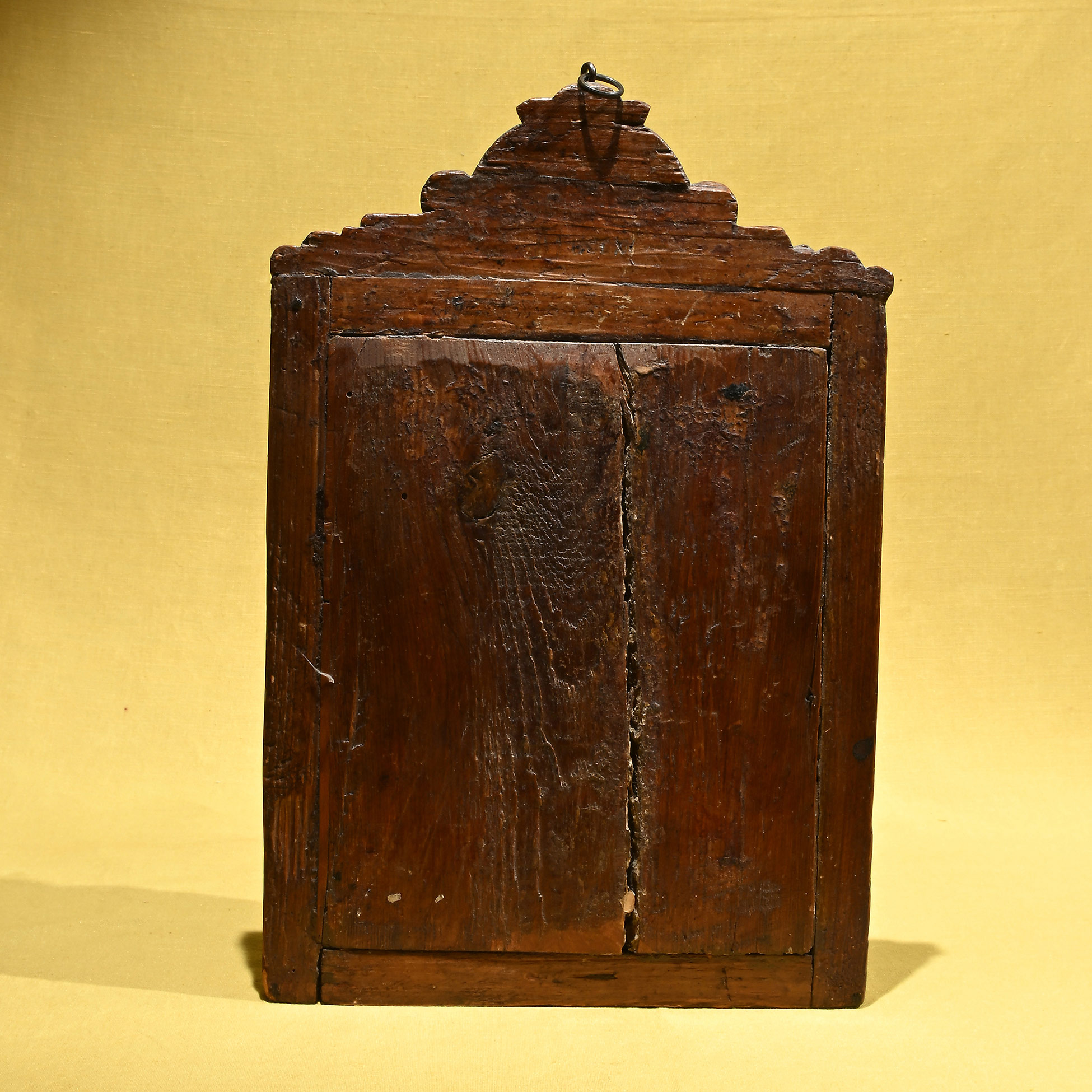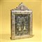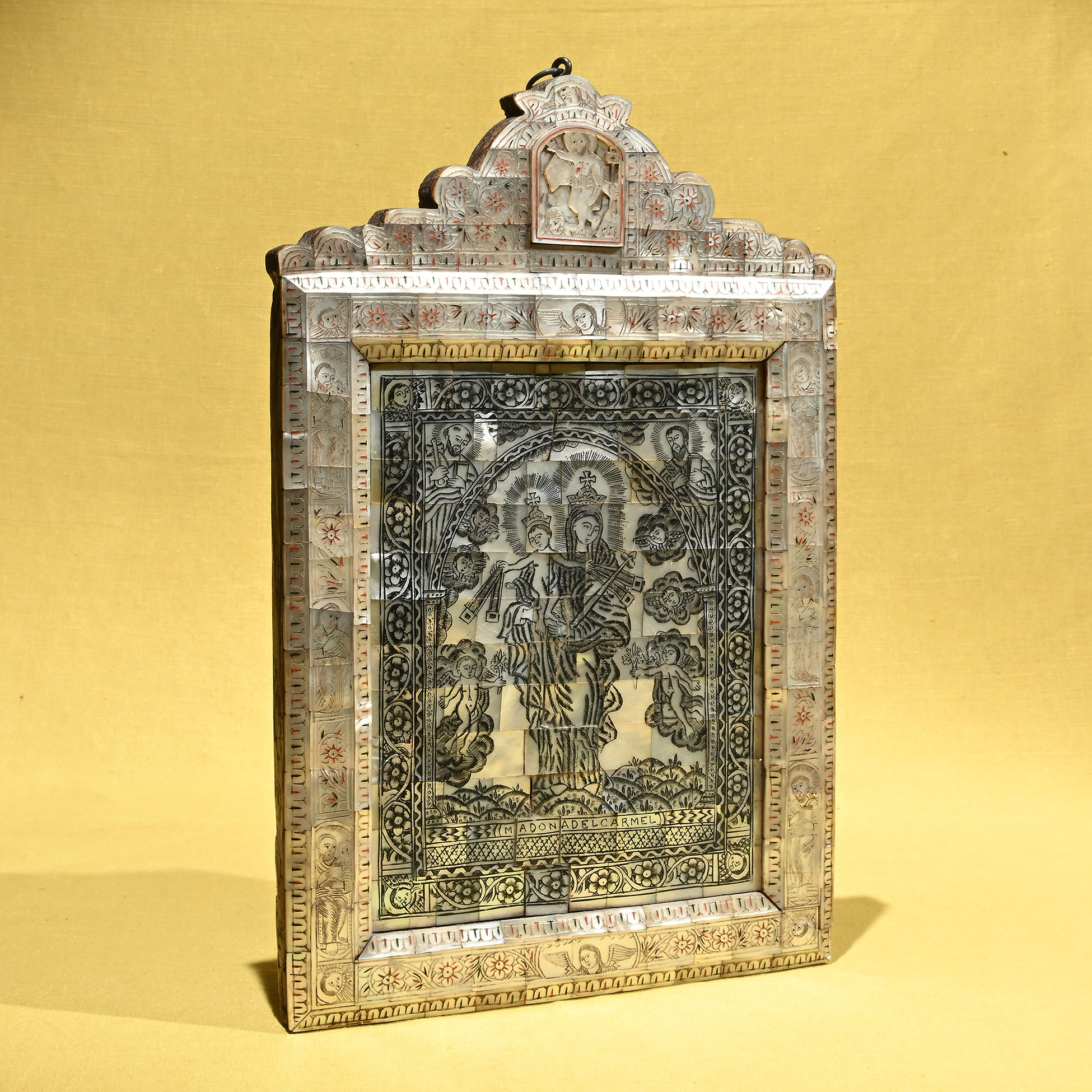 Placca con incisione su madreperla, manifattura mediorientale del XVIII secolo Soggetto raffigurante la Madonna del Carmelo. Dimensioni complessive 37x24,5x2 cm.