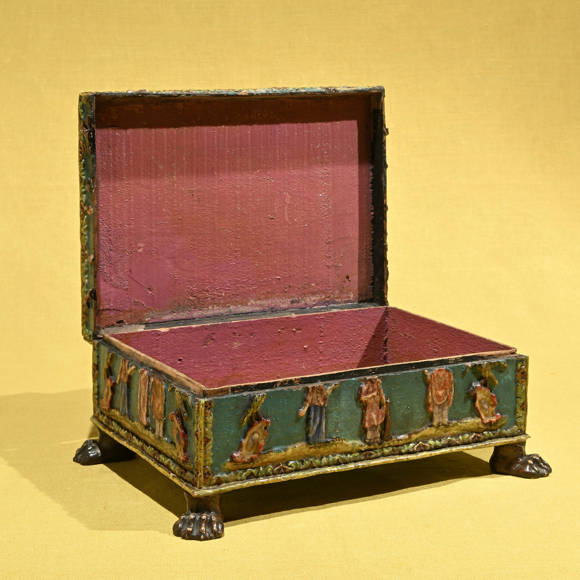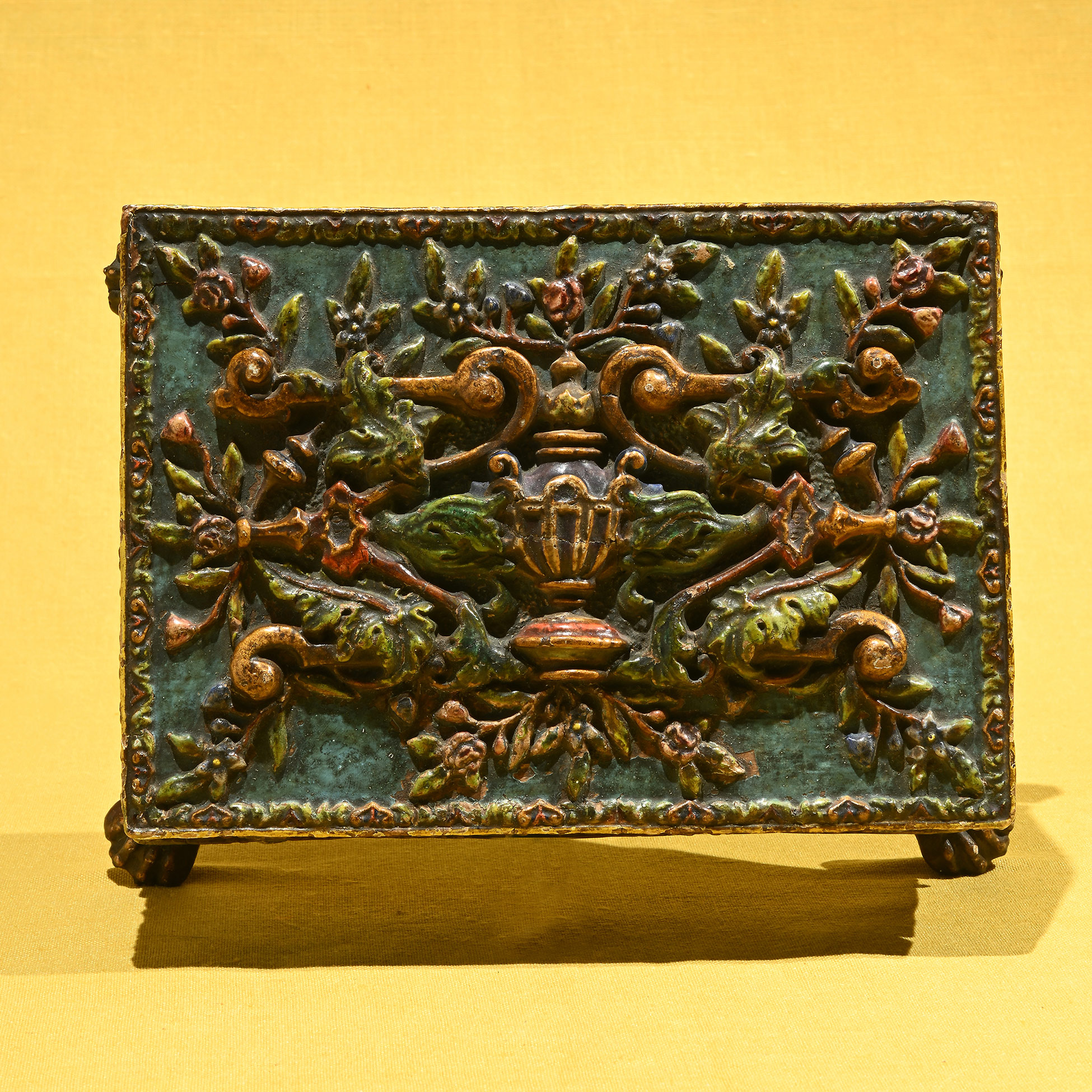 Cofanetto in legno laccato, Veneto XVIII secolo Posto su quattro peducci leonini, è decorato in altorilievo a motivi vegetali e floreali policromi; sui lati tre figure femminili accompagnate da due uccelli. Dimensioni complessive 8,5x21x15 cm.