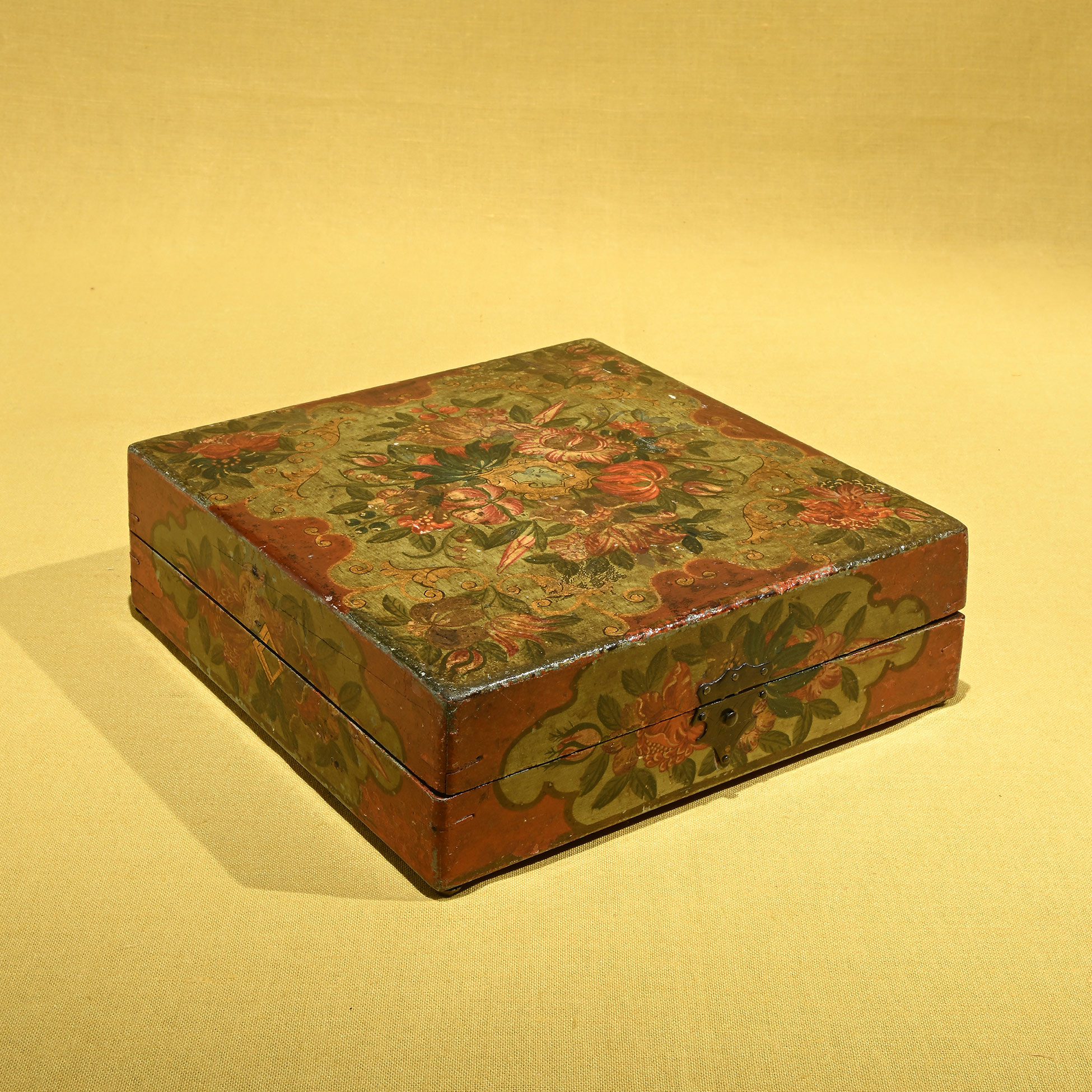 Scatola da gioco in legno e lacca, Venezia XVIII secolo Set composto da una scatola, un vassoio, quattro porta fiches, una penna e un piccolo taccuino; decorato a motivi floreali. Dimensioni complessive 7x21x21 cm.
