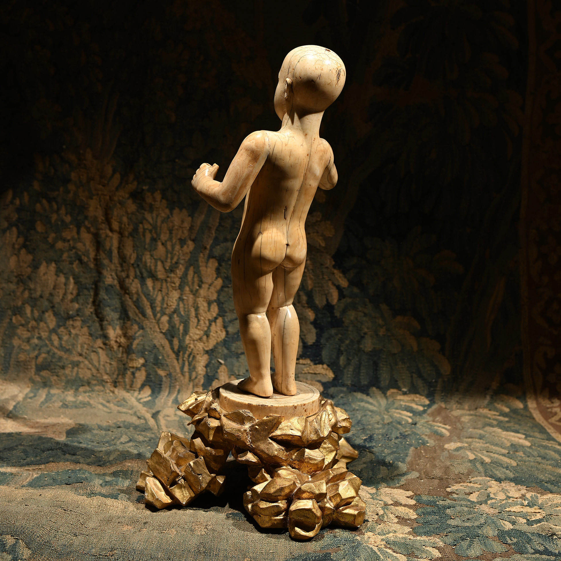 Scultura raffigurante il bambino Gesù benedicente, DOVE XVIII secolo Il presente lotto è accompagnato da documentazione CITES; rilievo posto su una elegante base in legno dorato. Dimensioni complessive 47x25x25 cm.