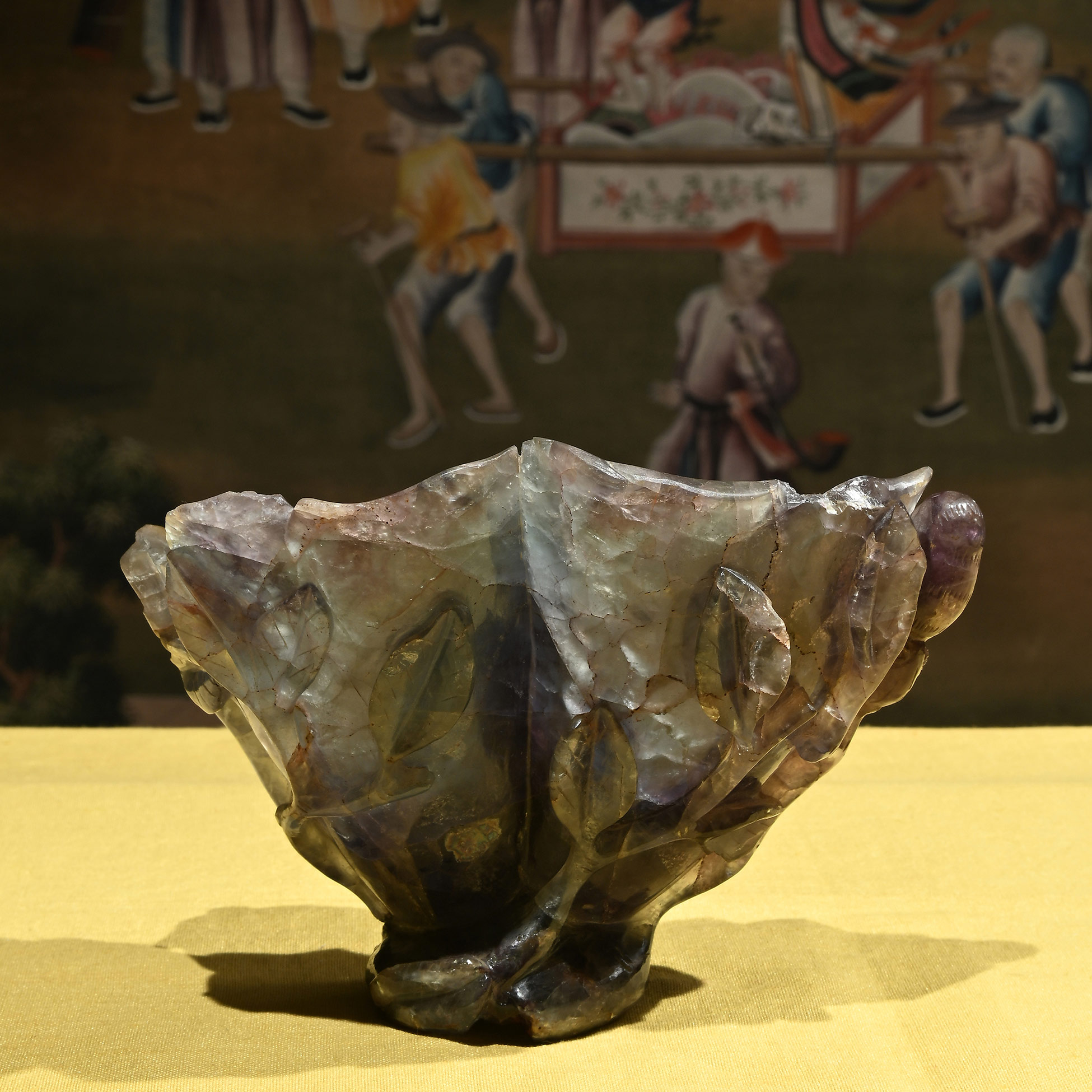 Vaso in quarzo viola, Cina XIX secolo Con tralci di vegetali a rilievo. Dimensioni complessive 13x18x9 cm.