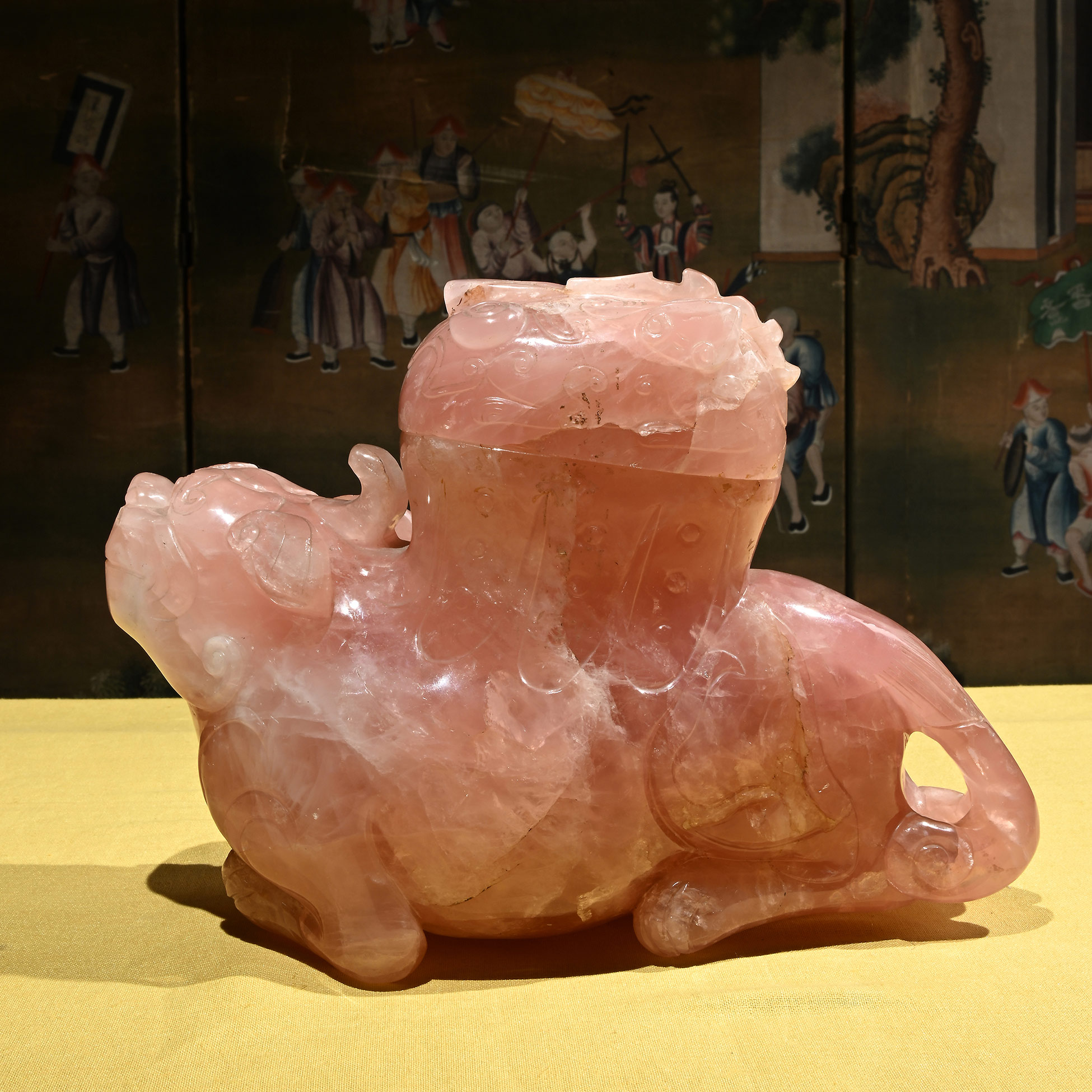 Grande vaso con coperchio in quarzo rosa, Cina fine del XIX secolo Il recipiente è modellato in forma di una fiera mitologica. Dimensioni complessive 21,5x31x12 cm.