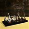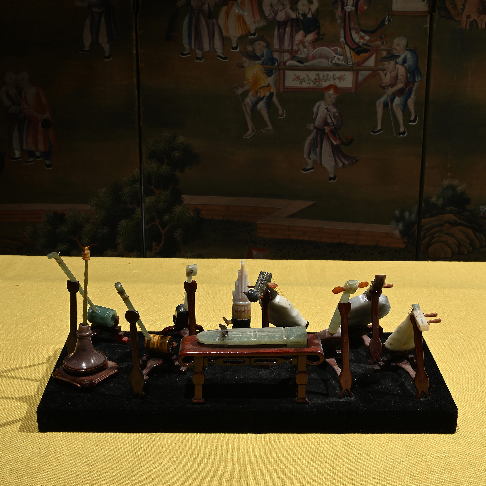 Dieci miniature di strumenti musicali in pietra dura, Cina inizi del XX secolo Gli strumenti sono incollati su piedistalli in legno, a loro volta ancorati ad una base in legno e velluto nera. Dimensioni complessive 12x31,5x14 cm.