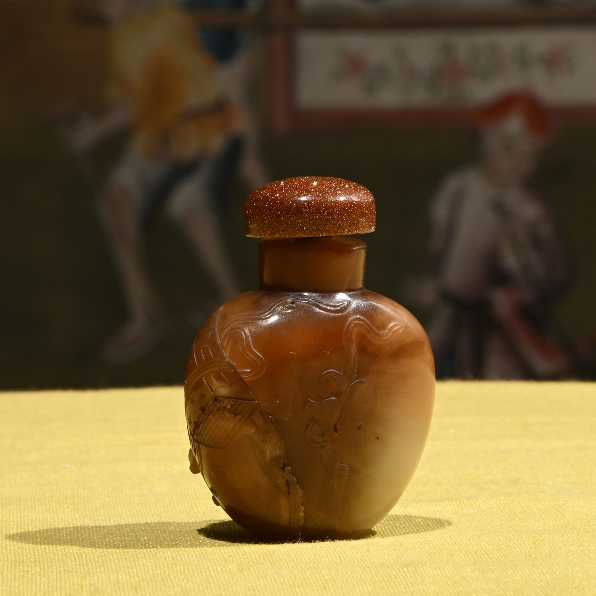 Snuff bottle in pietra dura e avventurina, Cina XIX secolo Decorata sul corpo a motivi naturalistici. Dimensioni complessive 6x4x2 cm.