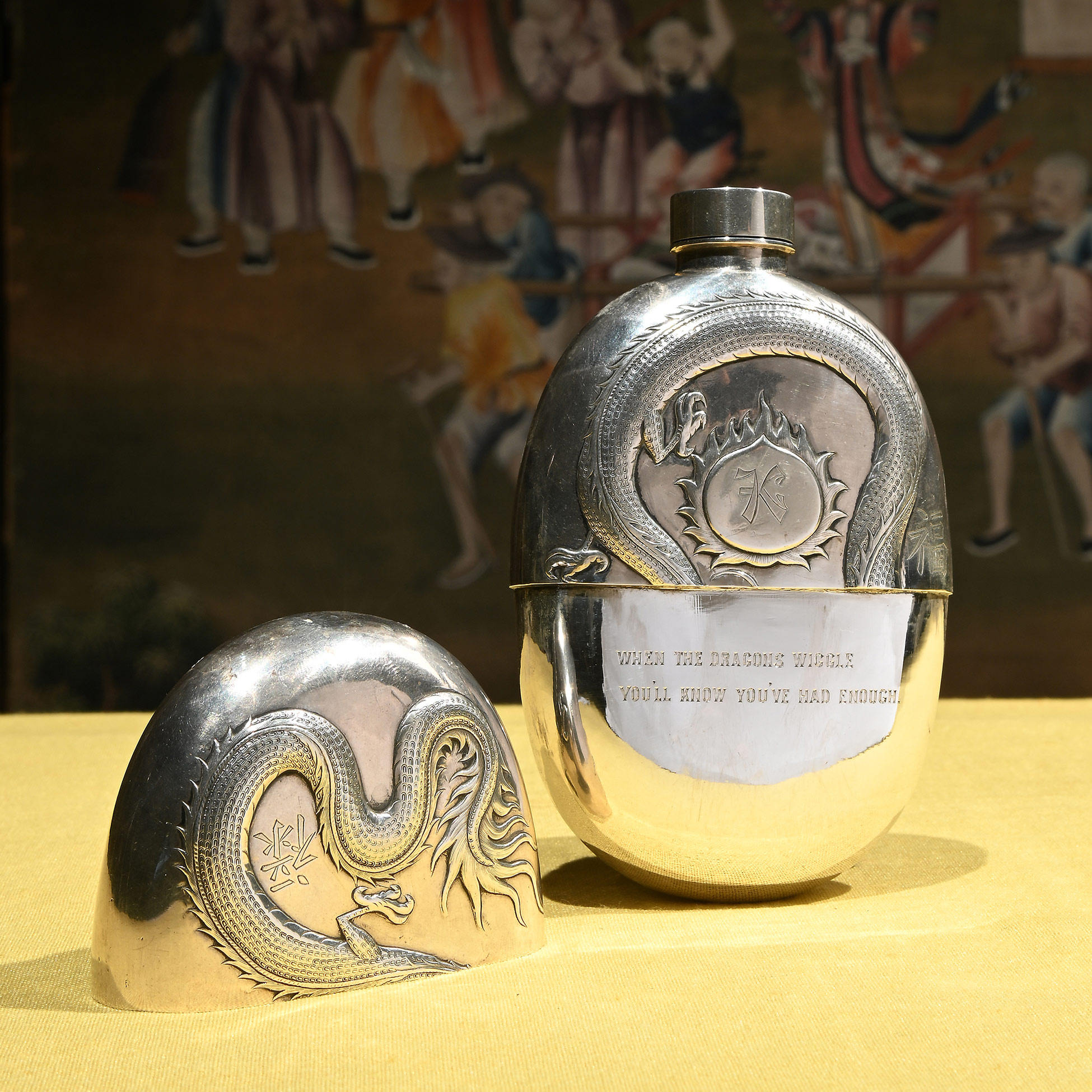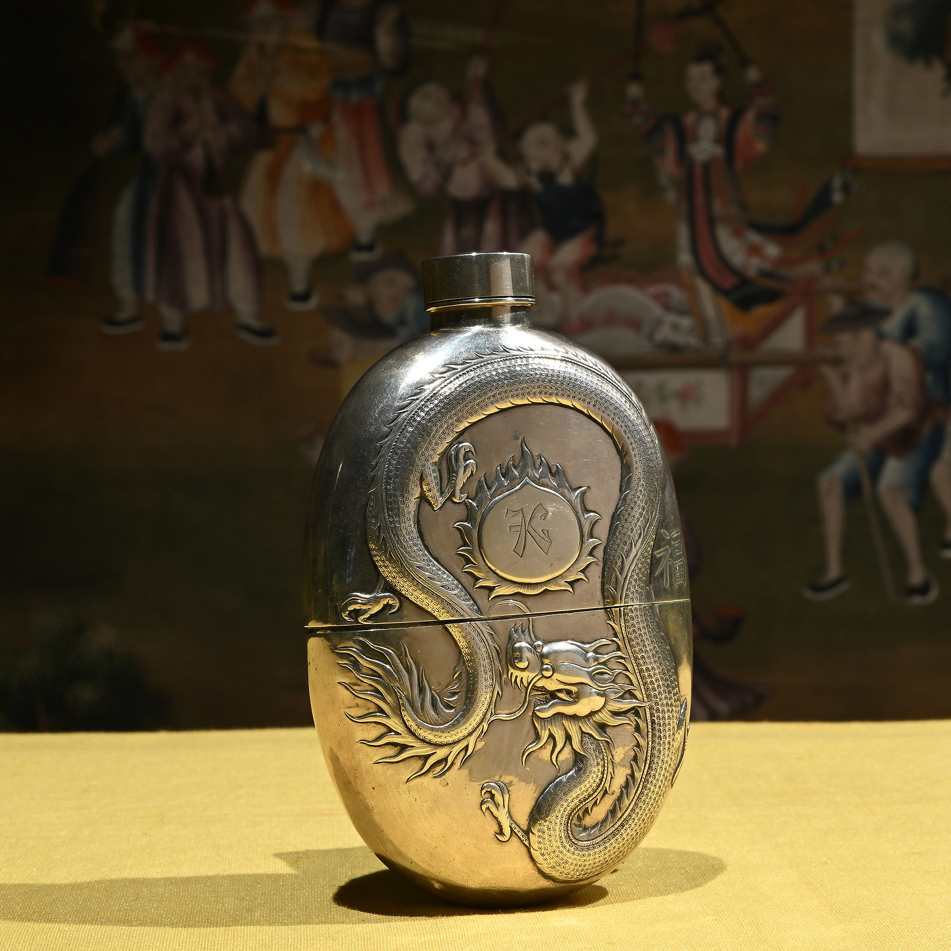 Fiasca in argento, Cina XIX secolo Decorata sul corpo a motivi di draghi. Dimensioni complessive 14x8,5x3,5 cm., peso complessivo gr. 307.
