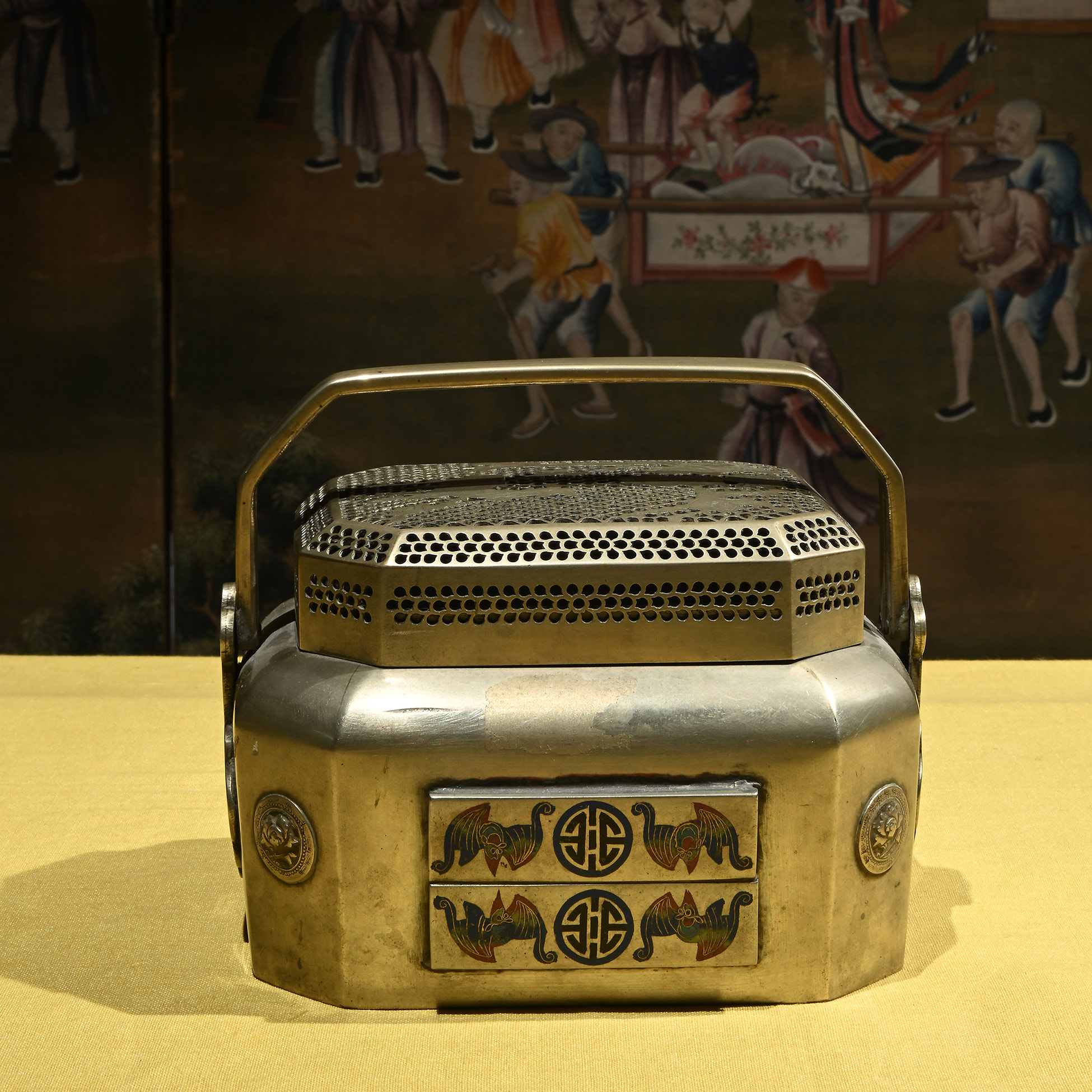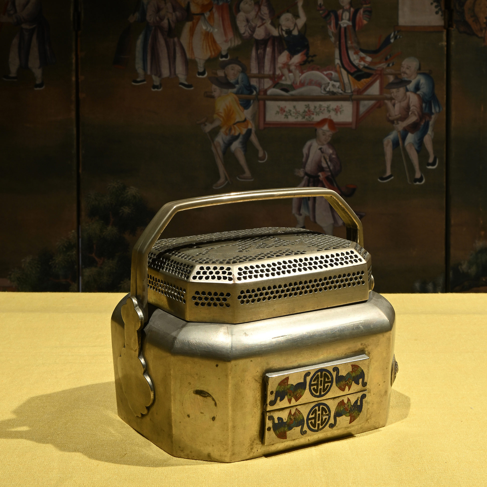 Scaldino in metallo, Cina metà del XIX secolo Decorato sul fronte a motivi di volatili realizzati a smalti policromi. Dimensioni complessive 12x17x15 cm.