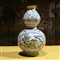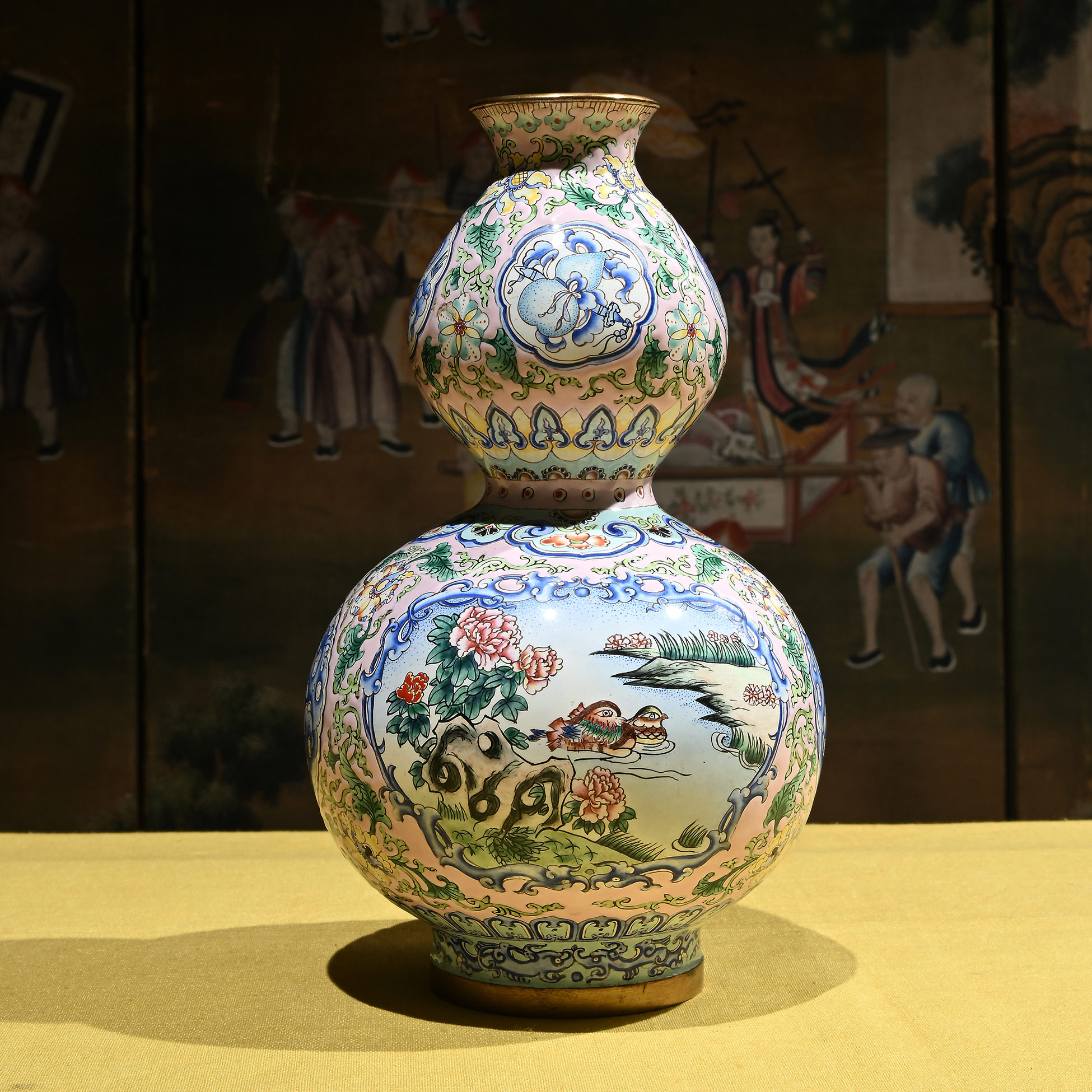 Vaso in rame smaltato, XX secolo Decorato a motivi vegetali, floreali e di uccelli sui toni dell'azzurro su fondo rosa. Dimensioni complessive 24x14x14 cm.