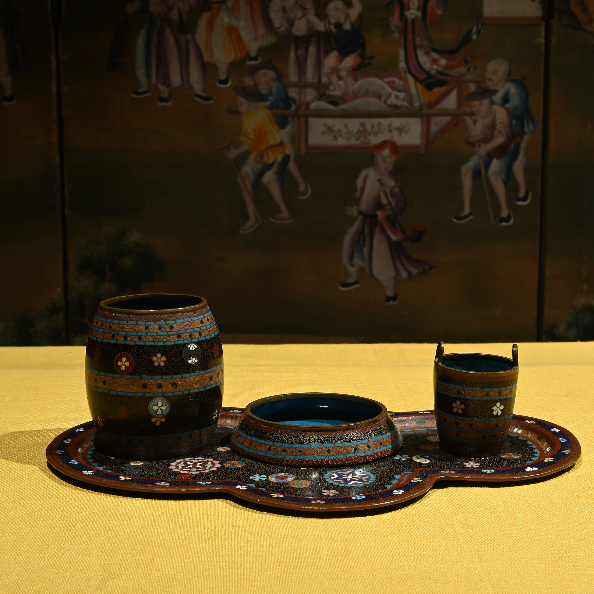 Vassoio e tre recipienti in smalto cloisonne, Giappone XIX secolo
