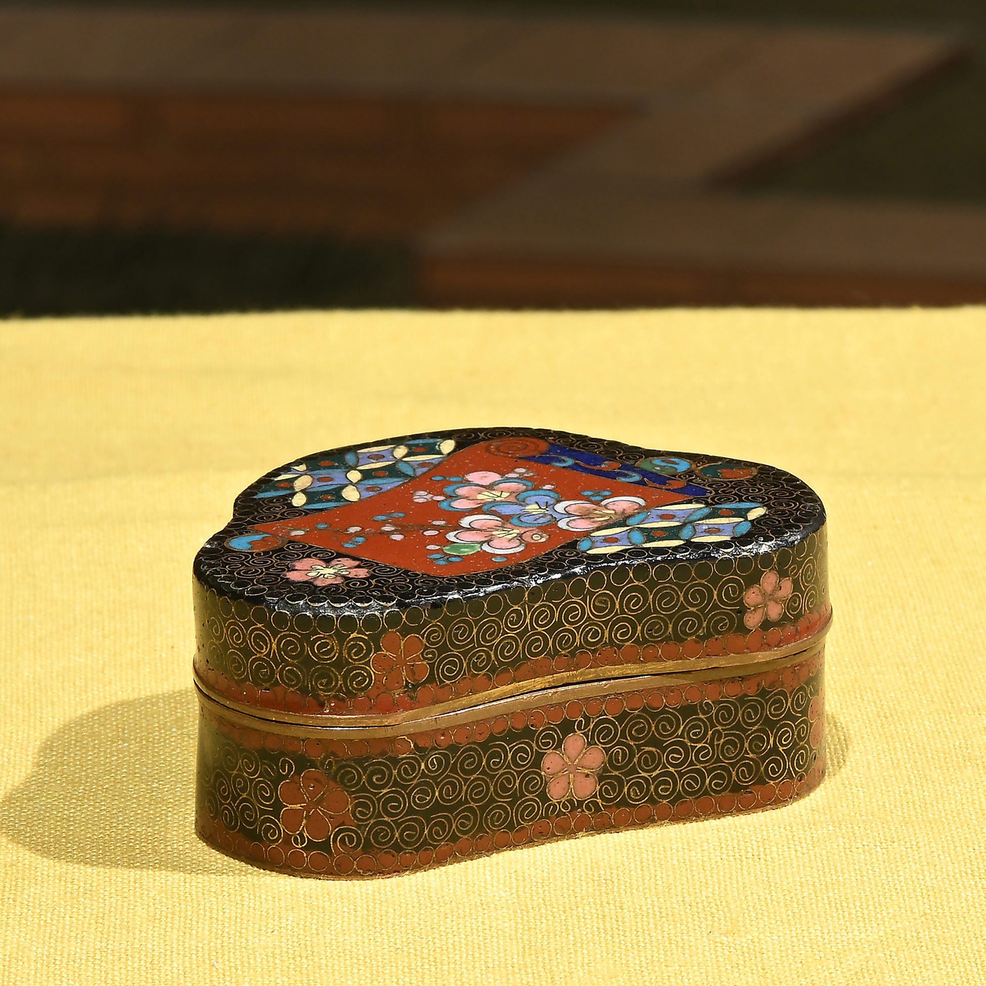 Porta pillole in smalto cloisonne, Giappone fine del XIX secolo Decorata a motivi astratti e floreali su fondo nero. Dimensioni complessive 3x6,5x5 cm.