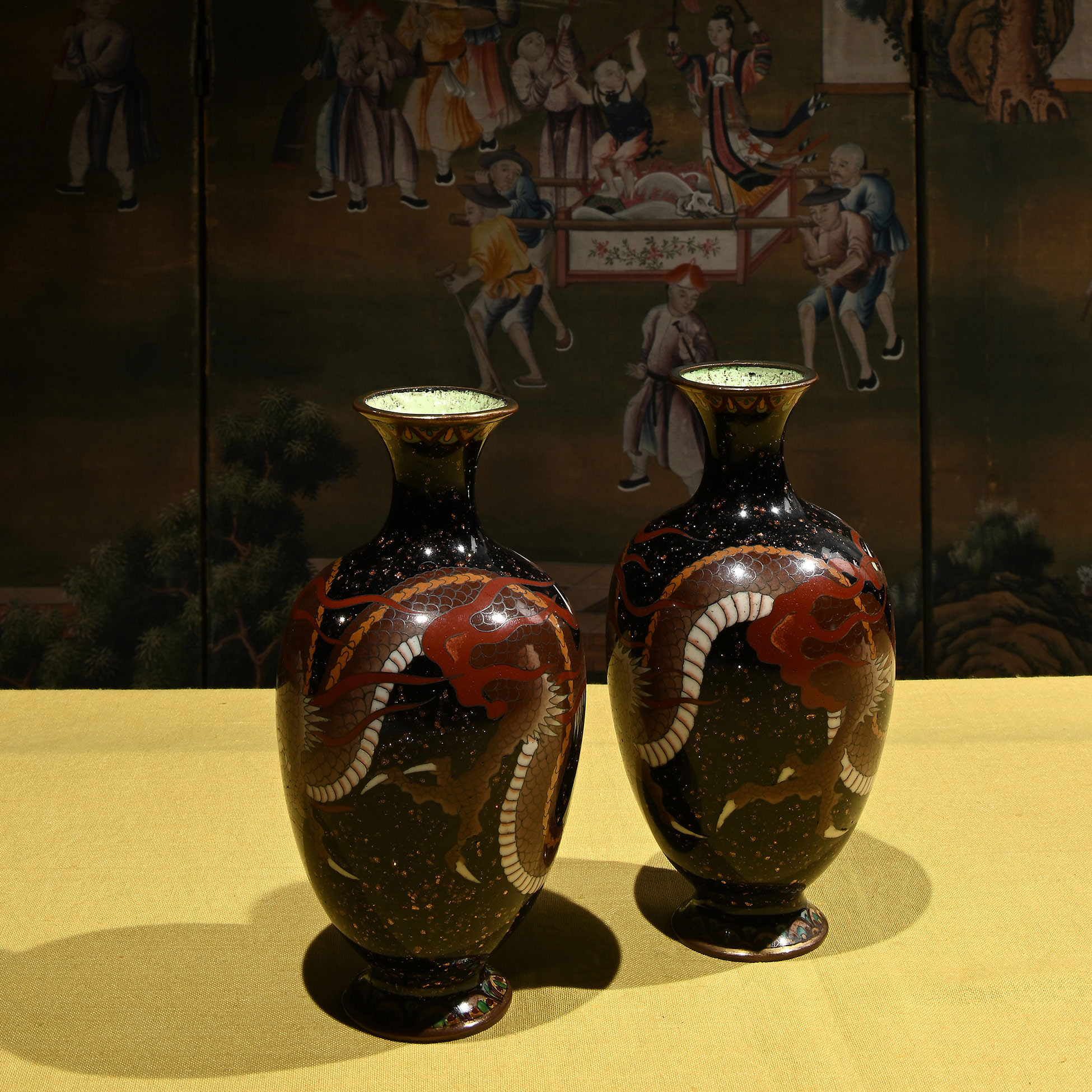 Coppia di vasi in smalto cloisonne, Giappone fine del XIX secolo Elegantemente decorati a motivi di draghi su fondo nero. Dimensioni complessive 19x9x9 cm. cad.