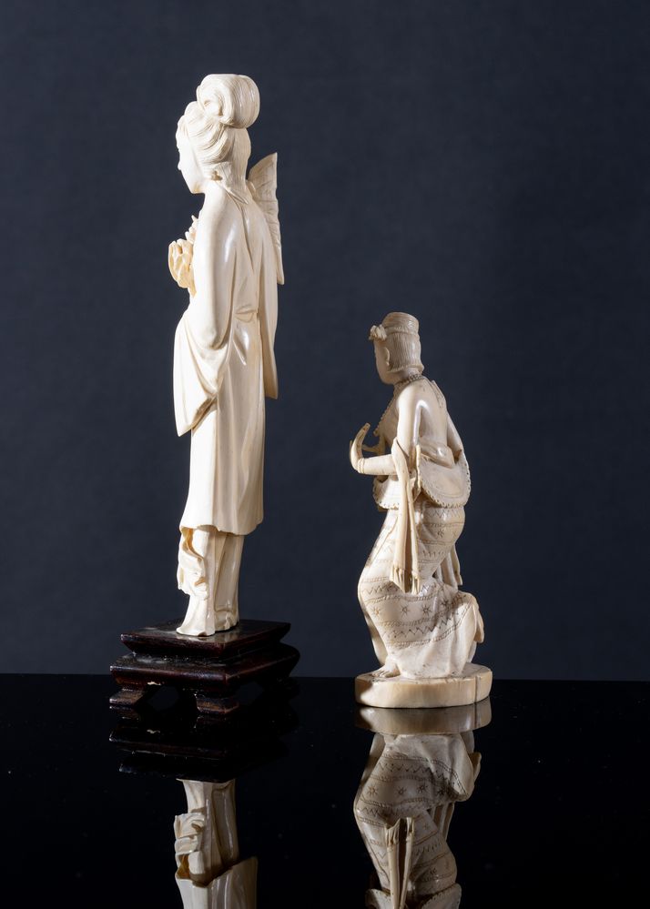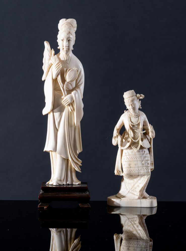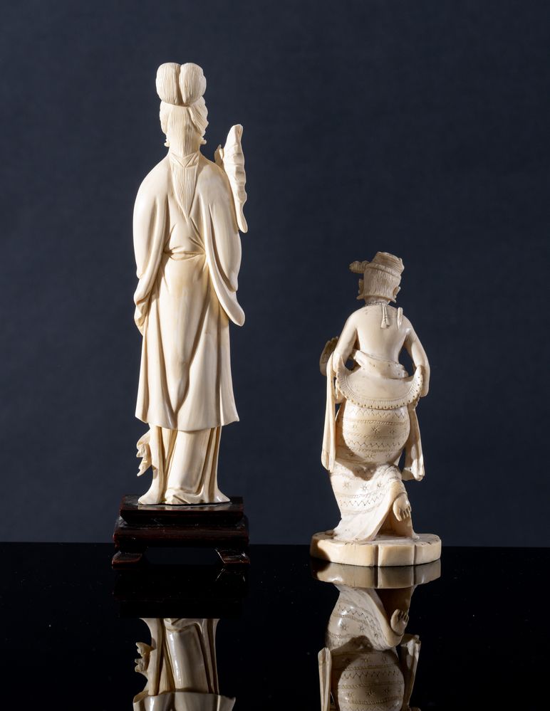 Coppia di sculture in avorio intagliato, raffiguranti figure femminili. Arte orientale, inizi del XX secolo. Cm 21x5.5x3. Cm 15x6x4. Lotto accompagnato da certificato CITES.